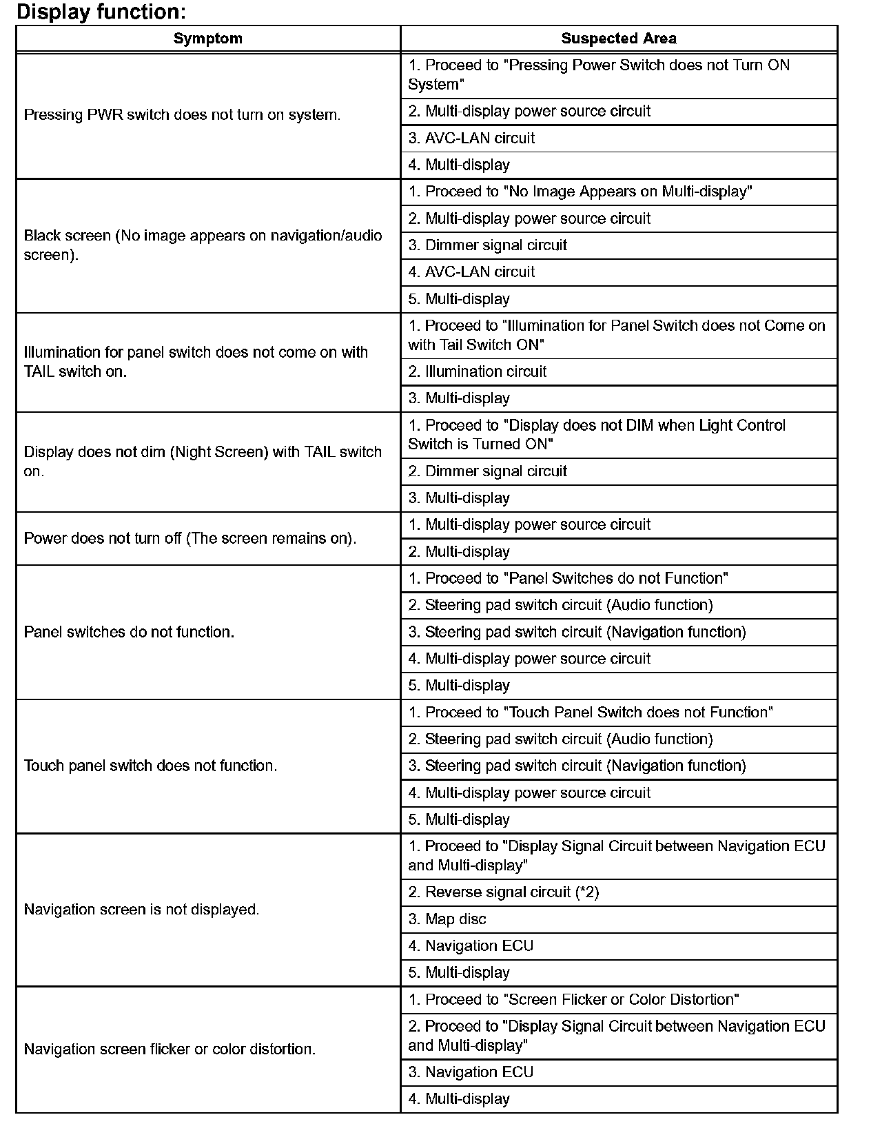 Problem Symptoms Table - Display Functon (Part 2):