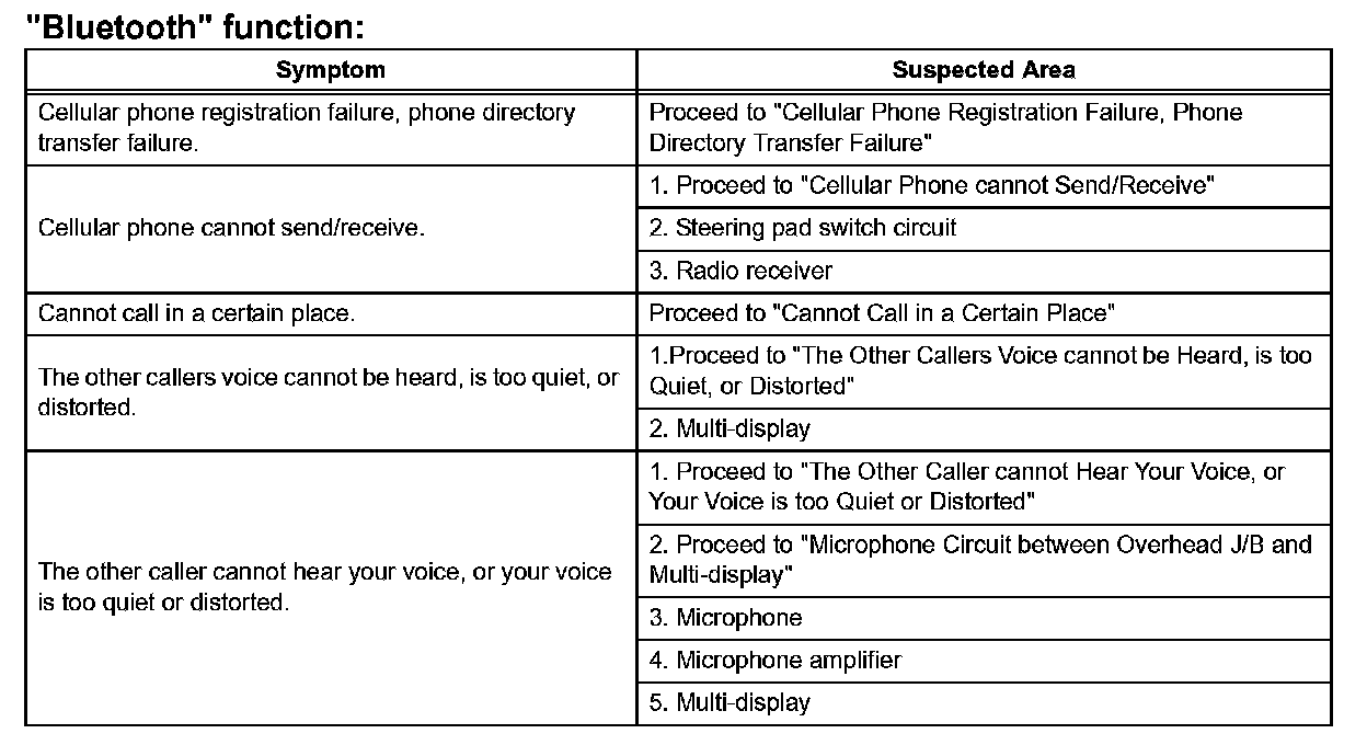 Problem Symptoms Table - "Bluetooth" Function: