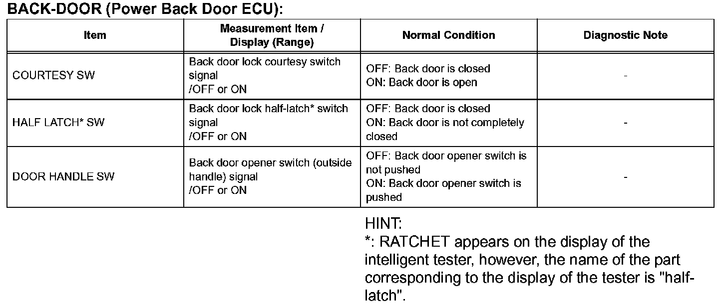 HINT: Using the intelligent tester's DATA LIST allows switch, actuator and other item values to be read without removing any parts. Reading the DATA LIST early in troubleshooting is one way to save time.