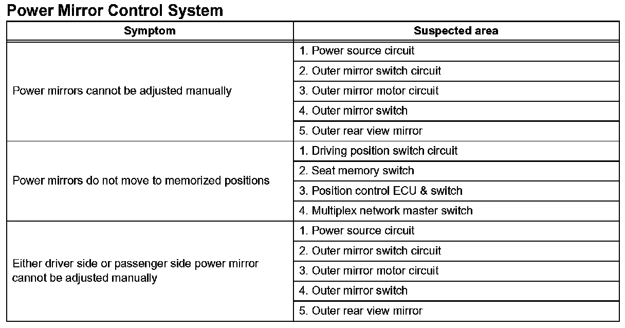 Problem Symptoms Table - Power Mirror Control System (w/ Memory):