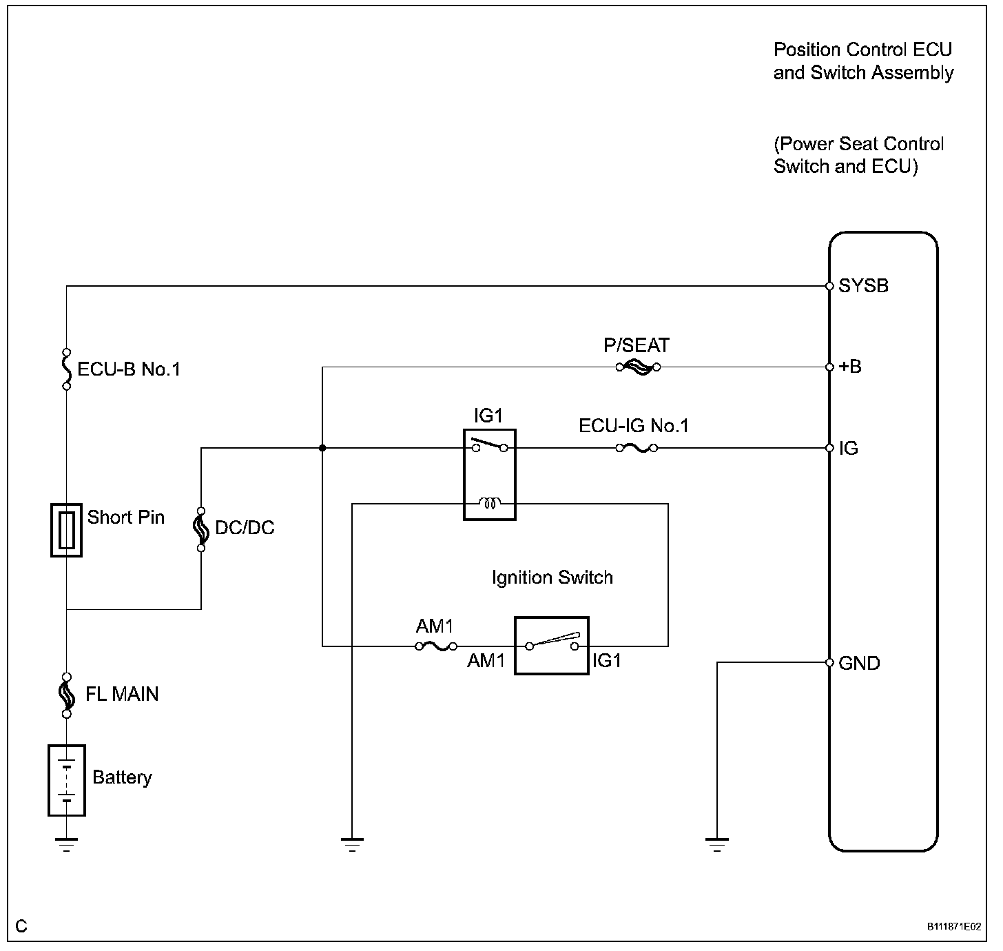 This circuit is the power source circuit for the position control ECU and switch assembly (power seat control switch and ECU).