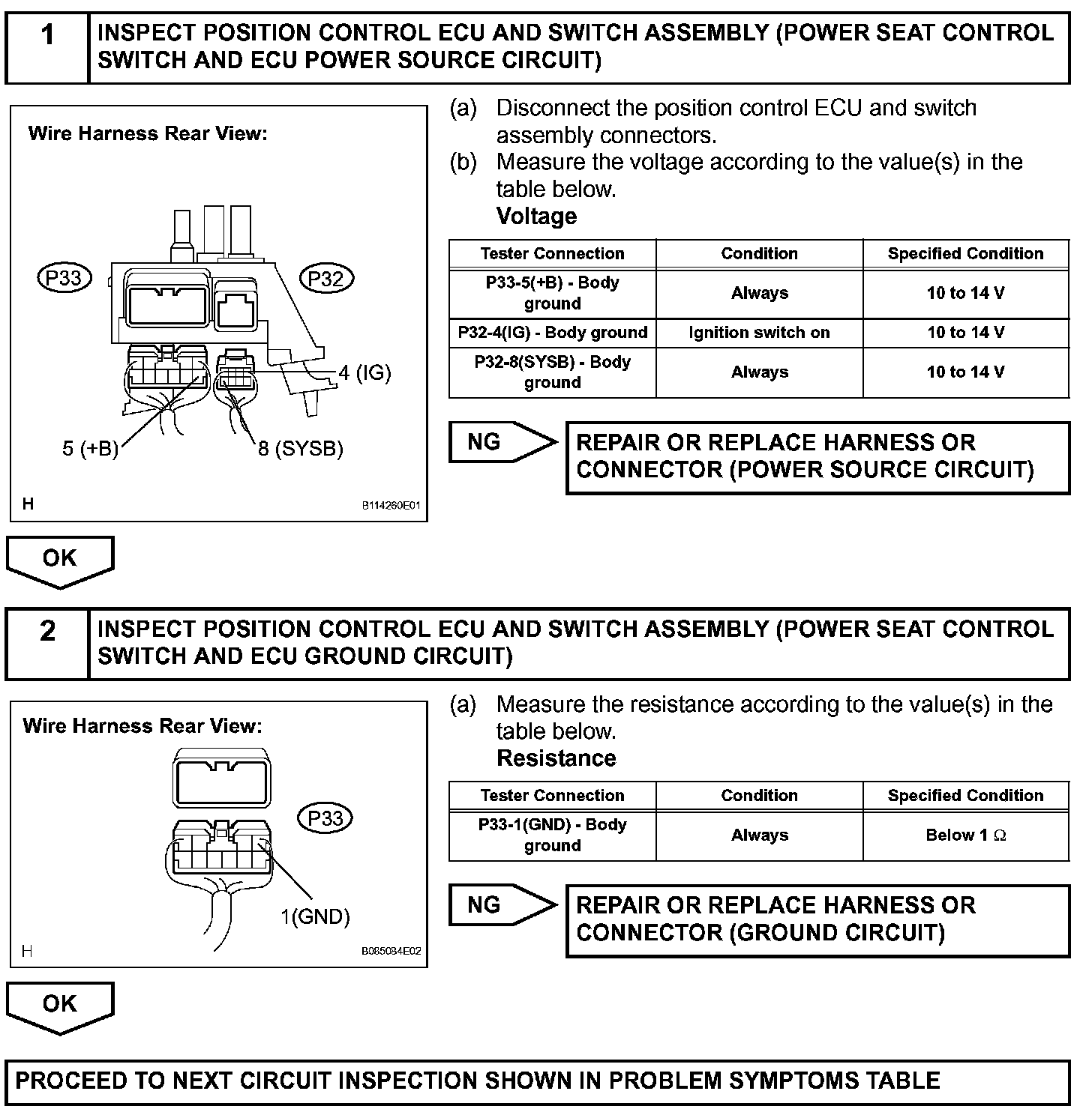 HINT: Manual adjustment of the slide, reclining, or lumbar can be performed even when the front power seat switch is not functional if current is allowed to flow into terminals +B and SYSB.
