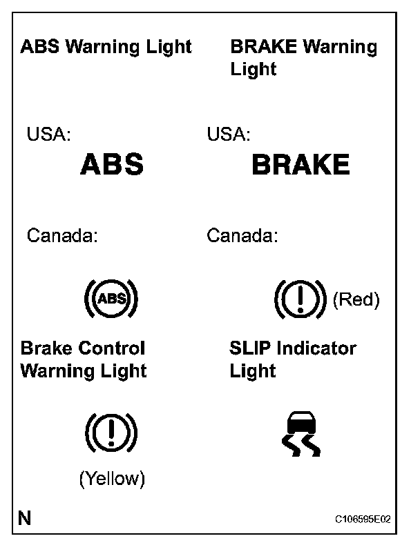- If the warning light and indicator light check result is not normal, proceed to troubleshooting for the ABS, BRAKE, brake control warning light circuits, and SLIP indicator light circuit.