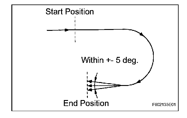 1. Move the shift lever to the D position, drive the vehicle at a speed of approximately 3 mph (5 km/h), and turn the steering wheel either to the left or right 90° or more until the vehicle makes a 180° turn.