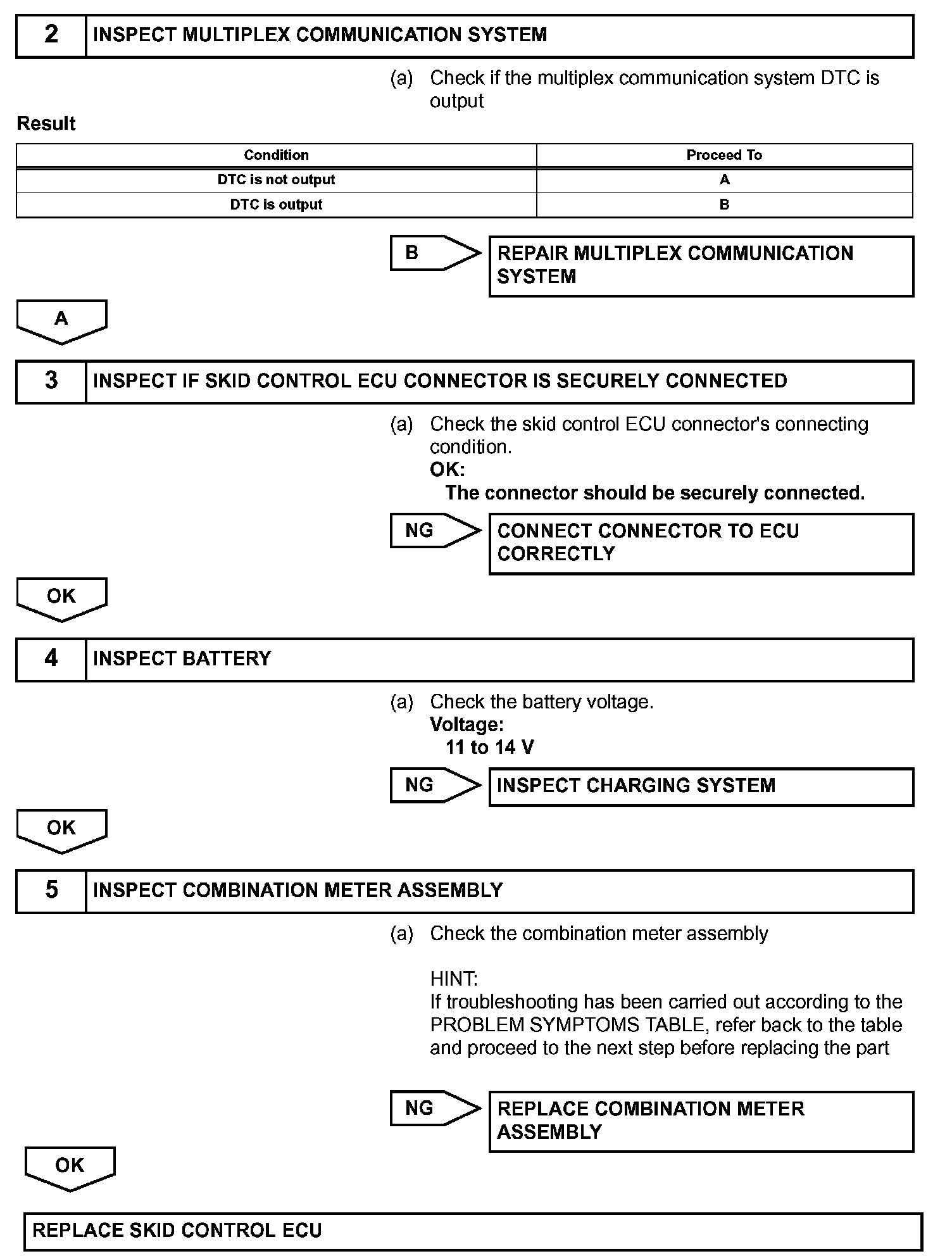 The skid control ECU is connected to the combination meter via CAN and multiplex communications.