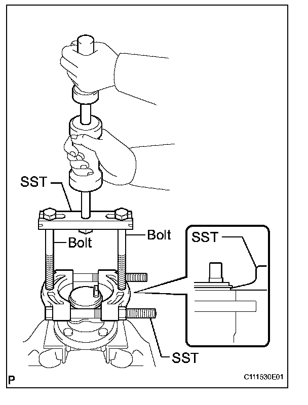 b. Using a pin punch and hammer, drive out the 2 pins and remove the 2 attachments from SST.
