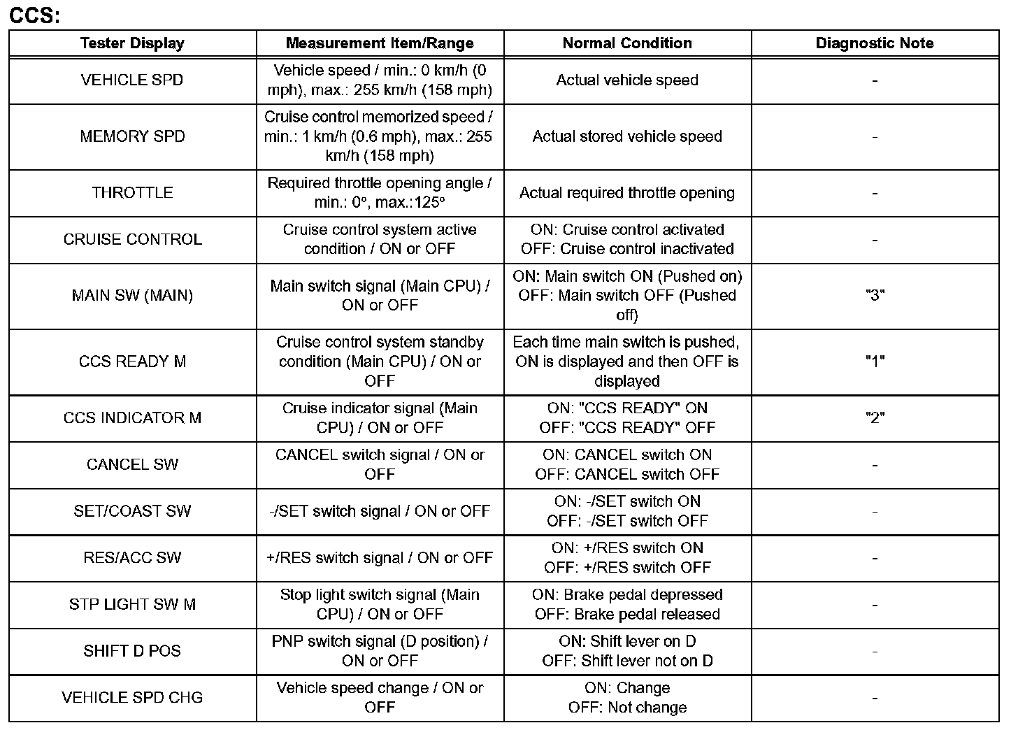 - "3" is but cruise indicator not turn on --> CRUISE MAIN indicator or wire harness or hybrid vehicle control ECU failure.