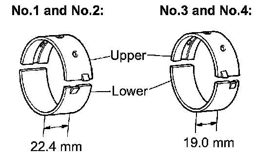 HINT: Main bearings come in widths of 22.4 mm (0.882 inch) and 19.0 mm (0.748 inch). Install the 22.4 mm (0.882 inch) bearings in the No. 1 and No. 2 cylinder block journal positions with the main bearing cap. Install the 19.0 mm (0.748 inch) bearings in the No. 3 and No. 4 positions.