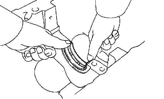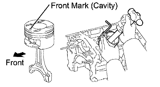 c. Using a piston ring compressor, push the correctly numbered piston and connecting rod assemblies into each cylinder with the front mark of the piston facing forward.