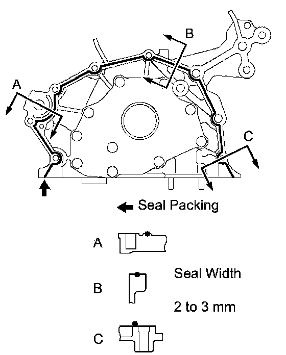c. Apply a continuous bead of seal packing (Diameter 2 to 3 mm (0.08 to 0.12 inch)) as shown in the illustration.