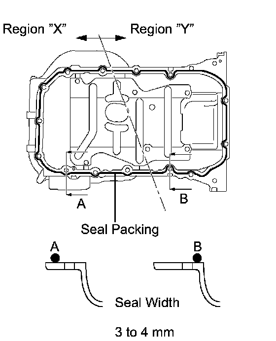 b. Apply a continuous bead of seal packing (Diameter 3 to 4 mm (0.12 to 0.16 inch)) as shown in the illustration.