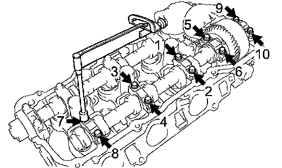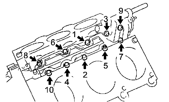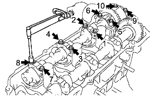 f. Using several steps, tighten the 10 bearing cap bolts uniformly in the sequence shown in the illustration.