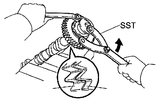 e. Using SST, align the holes of the camshaft main gear and sub-gear by turning camshaft sub-gear counterclockwise, and temporarily install a service bolt.