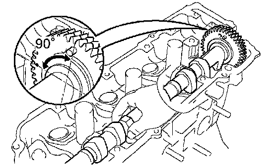 b. Place the No. 2 camshaft at a 90° angle of the timing mark (2-dot mark) on the cylinder head.