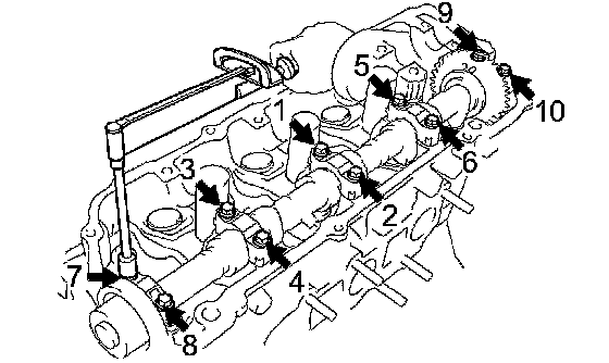 i. Using several steps, tighten the 10 bearing cap bolts uniformly in the sequence shown in the illustration.