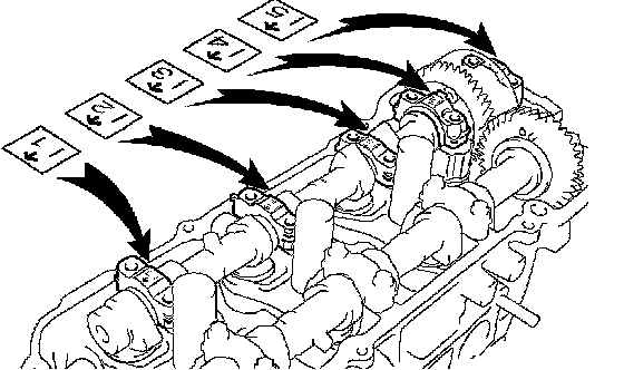 NOTICE: Since the thrust clearance of the camshaft is small, the camshaft must be kept level while it is being installed. If the camshaft is not kept level, damage to the cylinder head or to the camshaft may result. To avoid this, the following steps should be carried out.