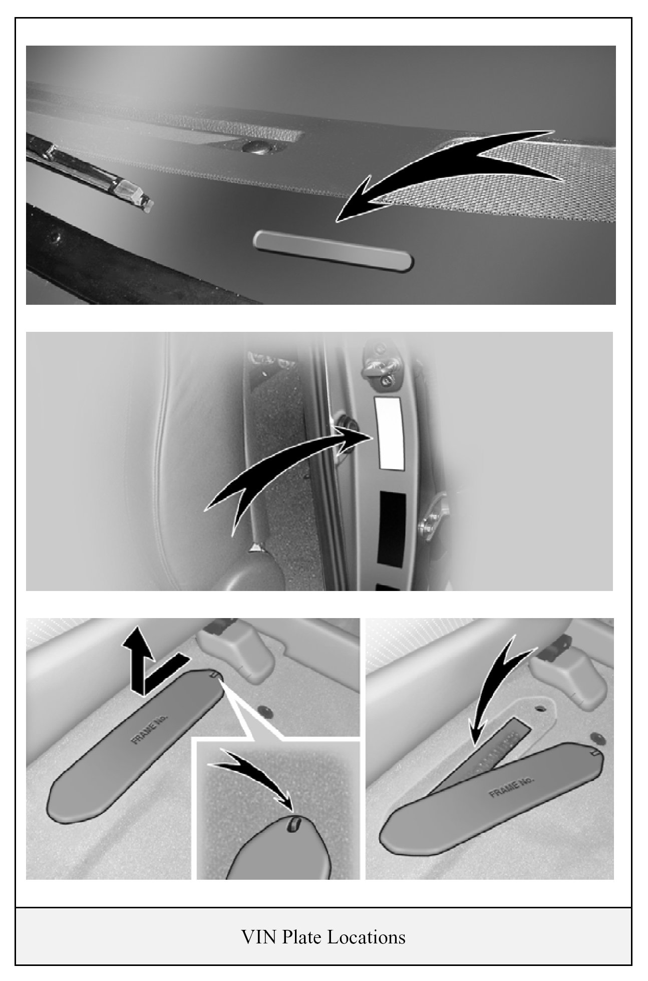 The alphanumeric 17 character Vehicle Identification Number (VIN) is provided in the front windshield cowl, driver door post, and under the front passenger seat.