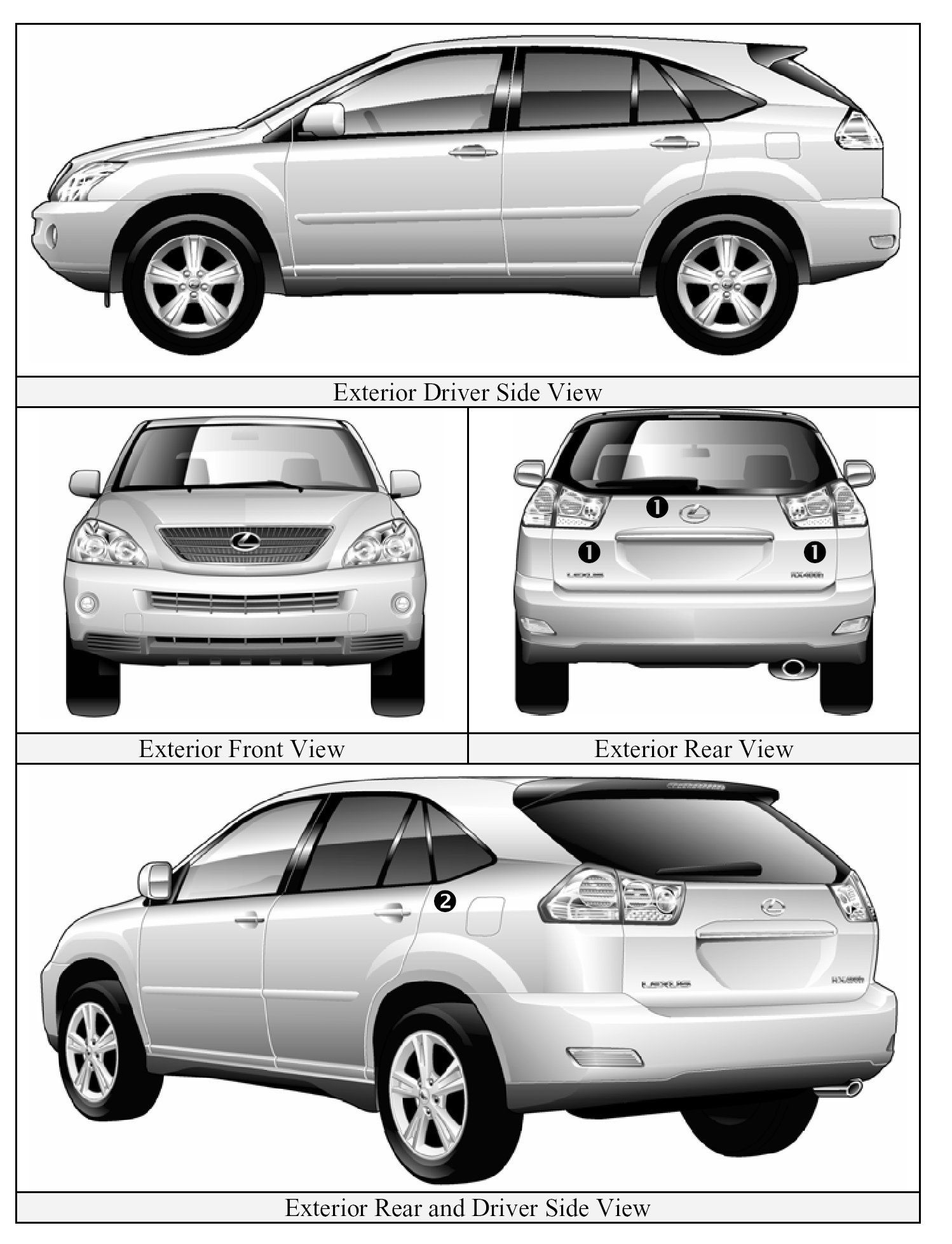 In appearance, the 2006 RX 400h is nearly identical to the conventional, non-hybrid Lexus RX 330. The RX 400h is a 5-door Luxury Utility Vehicle. Exterior, interior, and engine compartment illustrations are provided to assist in identification.