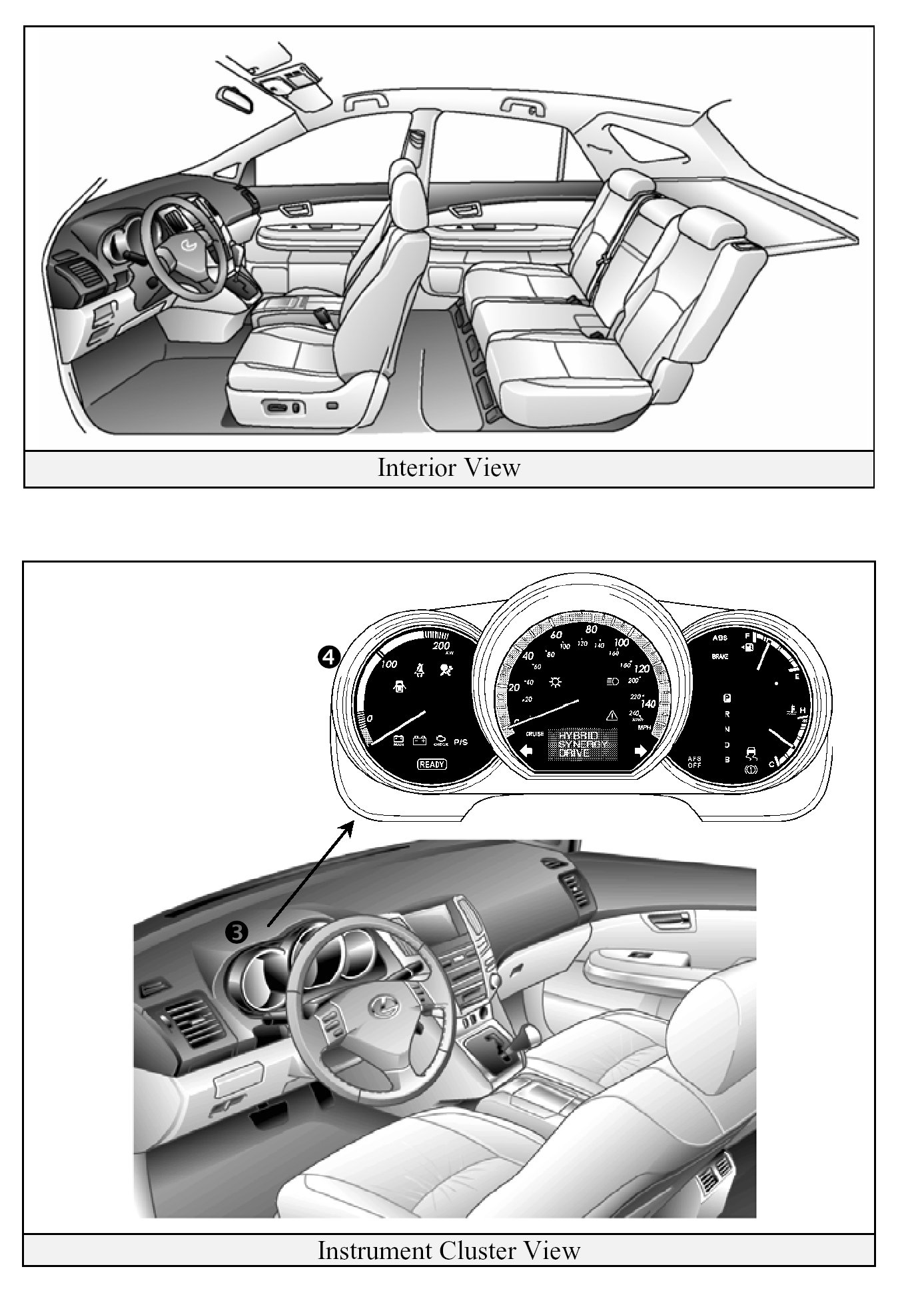 3 Instrument cluster (speedometer, fuel gauge, warning lights), located in the dash behind the steering wheel, is different than the one on the conventional, non- hybrid RX 330.