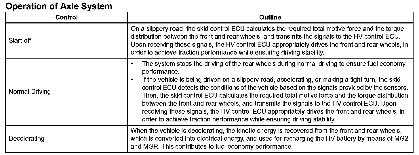 ^ Based on the front and rear wheel torque distribution values that have been calculated, the HV control ECU determines the ratio for operating the regenerative brakes of the MG2 and MGR. According to this ratio, the MG2 and MGR charge the HV battery. By converting the kinetic energy of the vehicle into electrical energy and recharging it in the HV battery, this system contributes to enhancing fuel economy.