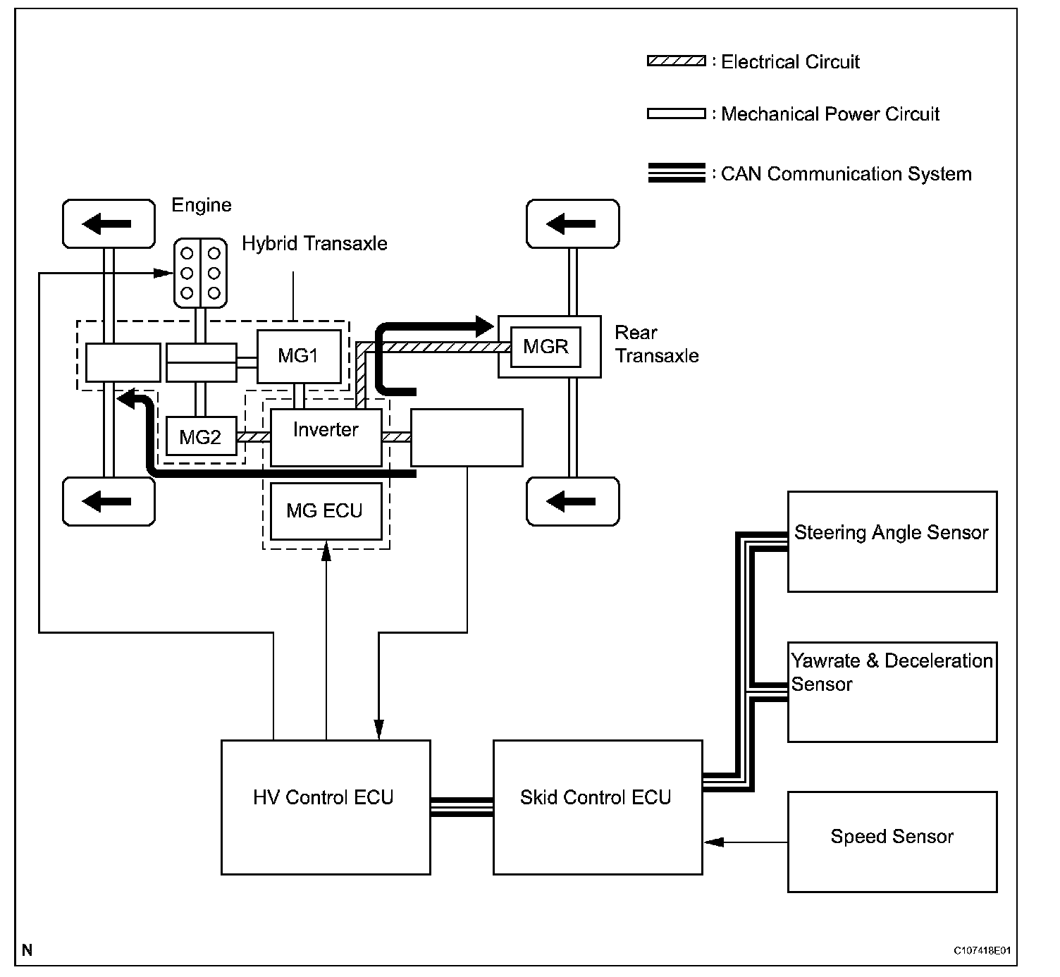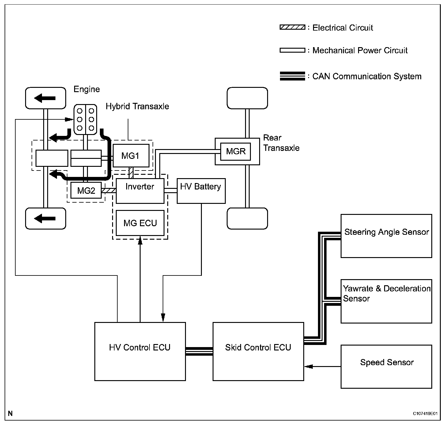 ^ Upon receiving the signals from the skid control ECU, the HV control ECU controls the motive forces of MG2 and MGR, in order to achieve traction performance while ensuring driving stability.
