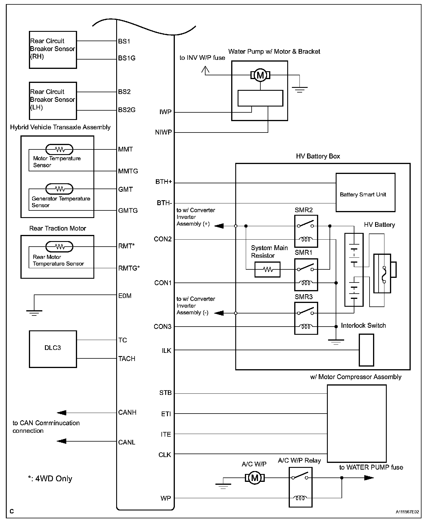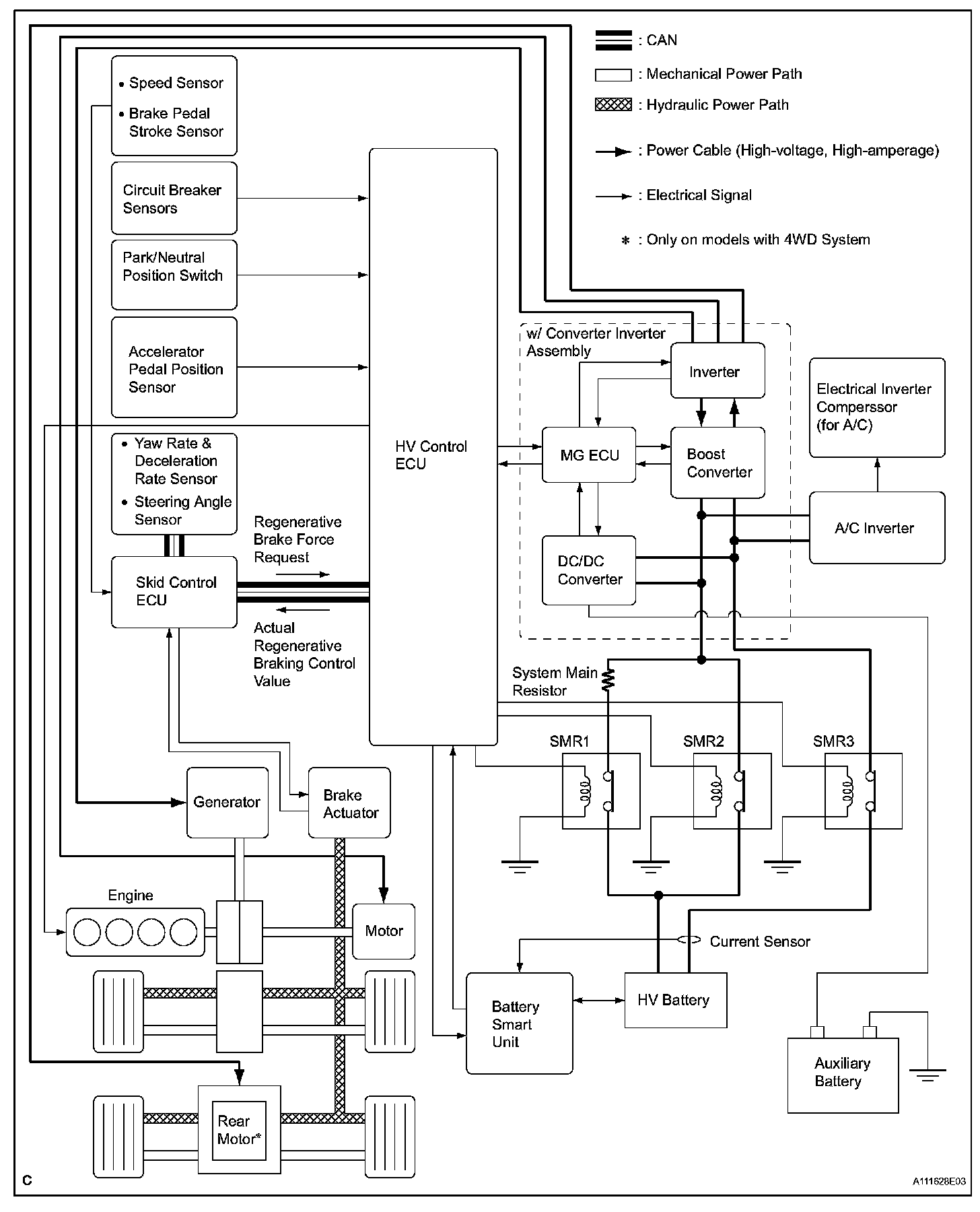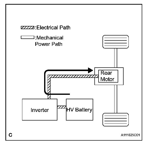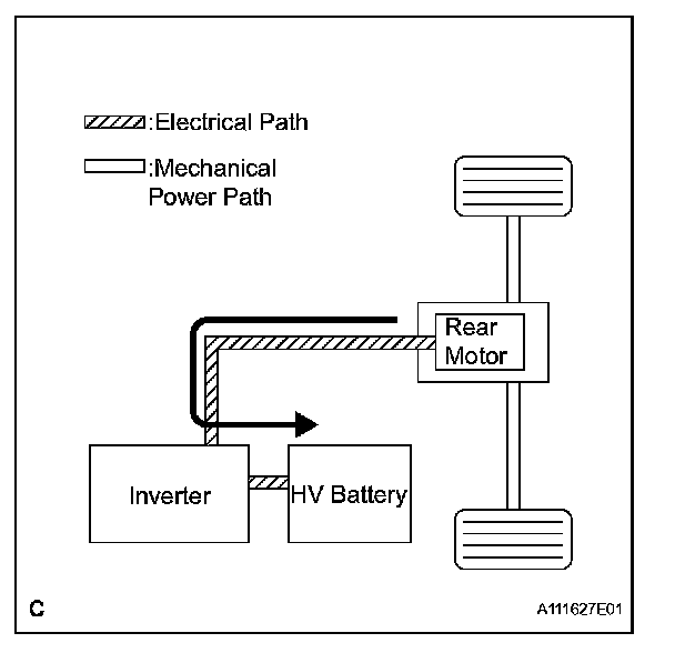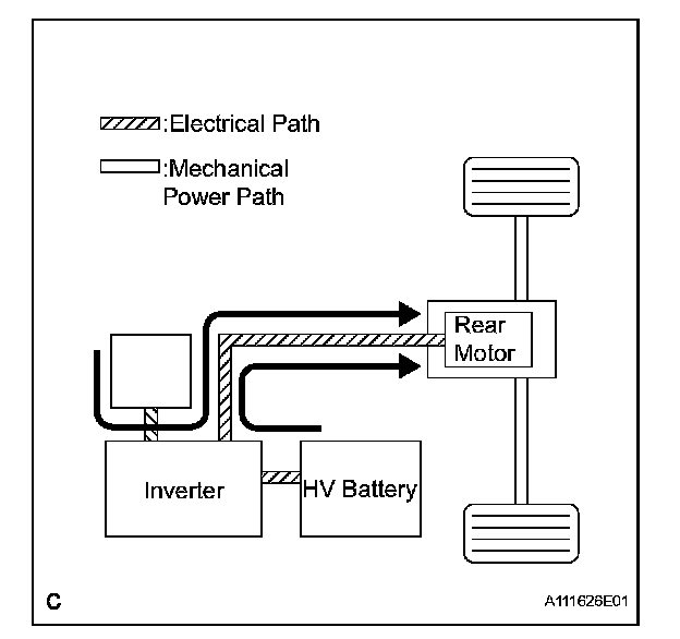 1. To ensure the proper driving force of the vehicle during start-off or acceleration, the electrical power of the HV battery is supplied to the Rear Motor in order to drive the rear wheels.
