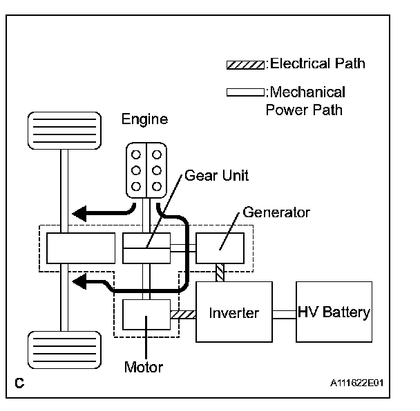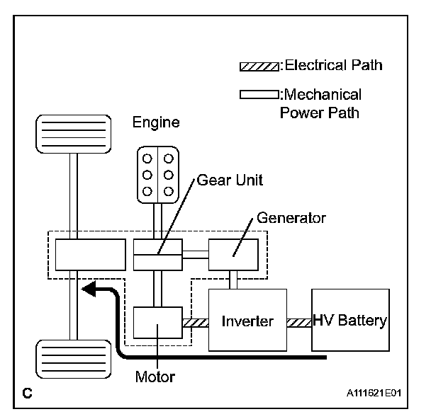 a. This system generates a motive force in combination with the engine, Generator, Motor, and Rear Motor (with 4WD system) in accordance with the driving conditions. Representative examples of the various combinations are described.
