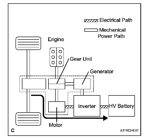 1. Supply of electrical power from the HV battery to the Motor provides force to drive the front wheels.