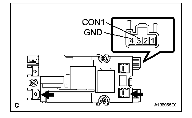 b. Increase battery voltage between the 3 (CON1. and 4 (GND) terminals of the connector for the relay drive of the HV relay assembly, and measure the resistance between the terminal of the HV battery side positive connector and the w/ convertor inverter assembly side positive terminal of the HV relay assembly.