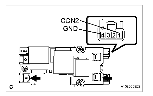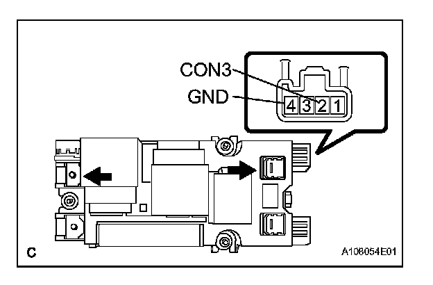 b. Increase battery voltage between the 2 (CON3. and 4 (GND) terminals of the connector for the relay drive of the HV relay assembly, and measure the resistance between the terminal of the HV battery side negative connector and the w/ converter inverter assembly side negative terminal of the HV relay assembly.