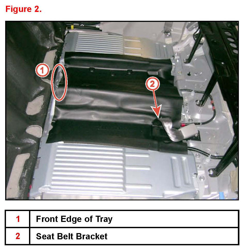 A. Slide the tray under the center seat belt bracket and ensure that the front edge of the tray is properly aligned with the HV Battery Upper Cover.