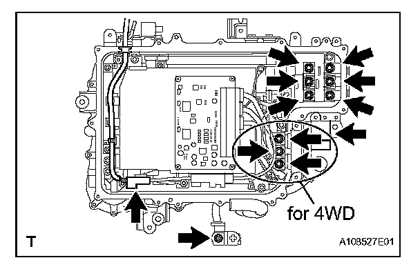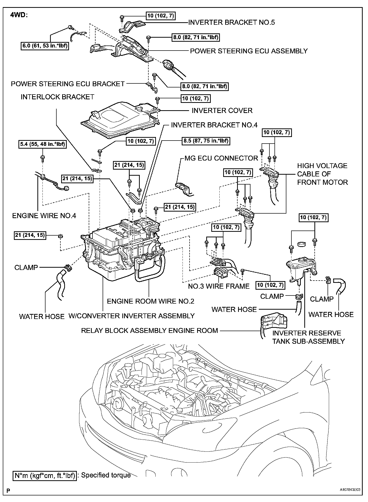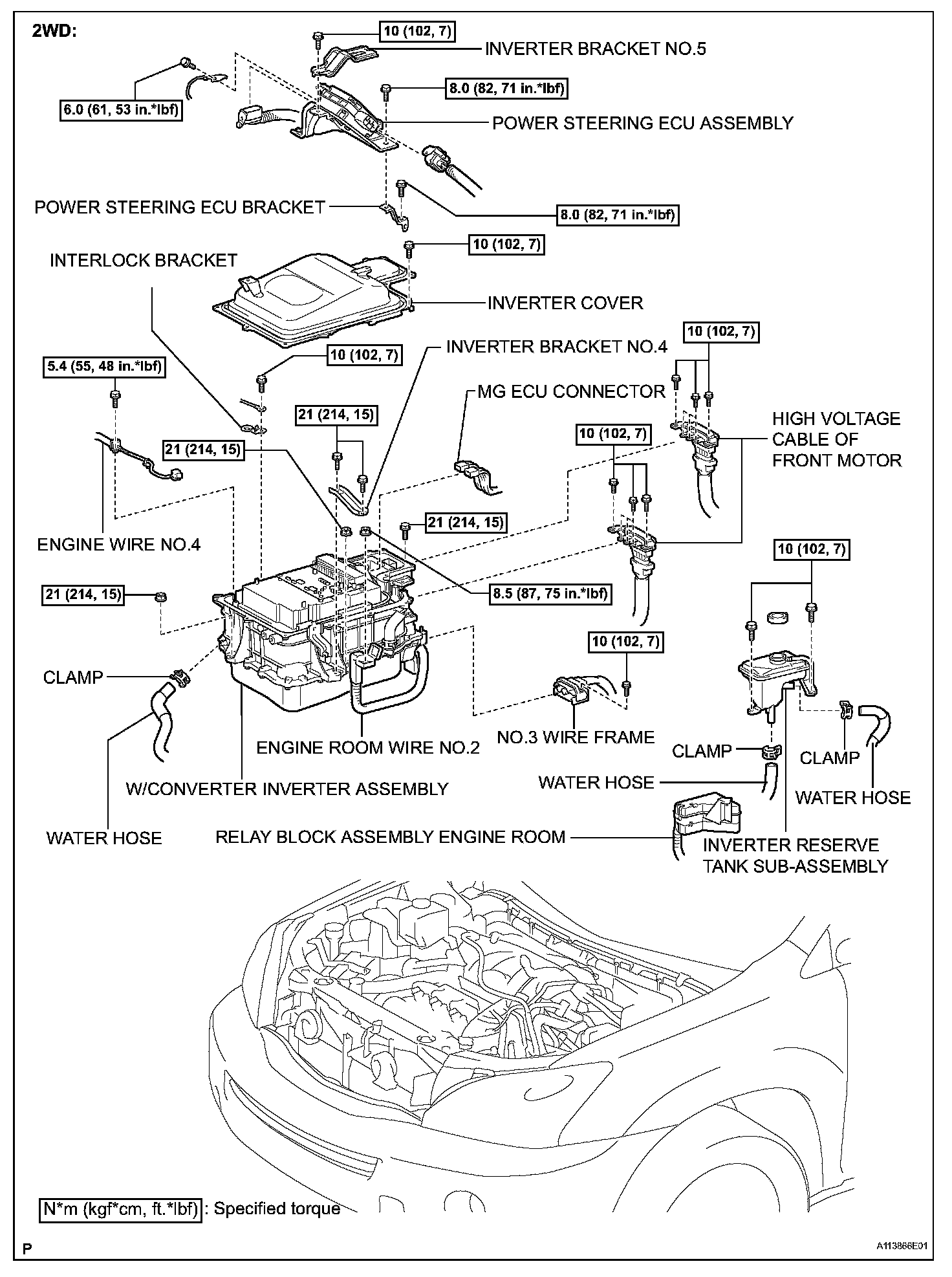b. Connect the No.3 wire frame (high voltage cable of the rear motor) with the 5 bolts to the w/ converter inverter assembly. (for 4WD)
