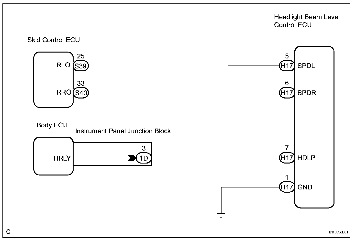 Headlight beam level control ECU receives the vehicle speed signal from the skid control ECU.