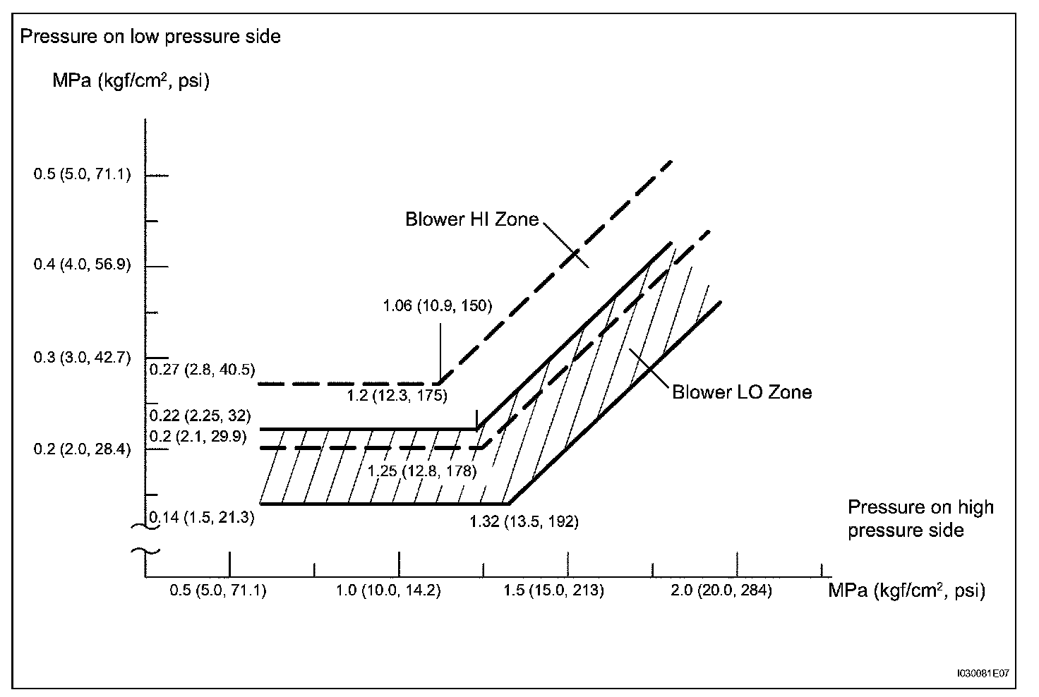 Low pressure side: 0.15 to 0.25 MPa (1.5 to 2.5 kgf/sq.cm, 21.3 to 35.5 psi)