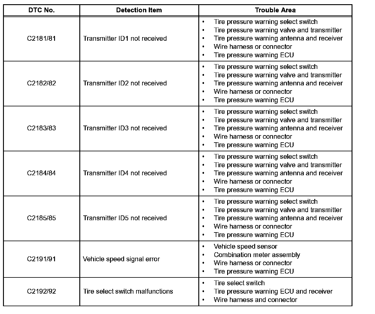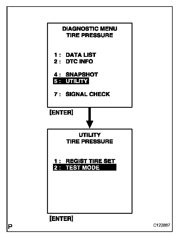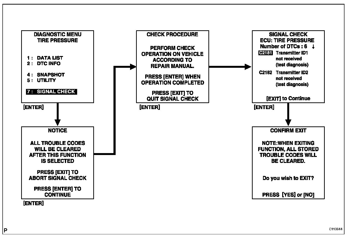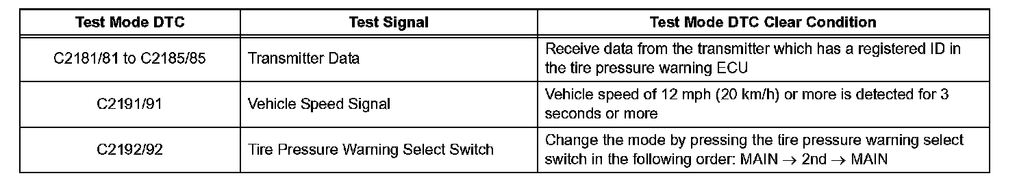 ^ When entering signal check mode, the tire pressure warning ECU sets all the signal check DTCs first. After completing signal check for each inspection item, the DTCs for systems that are determined to be normal by the tire pressure warning ECU will be erased.