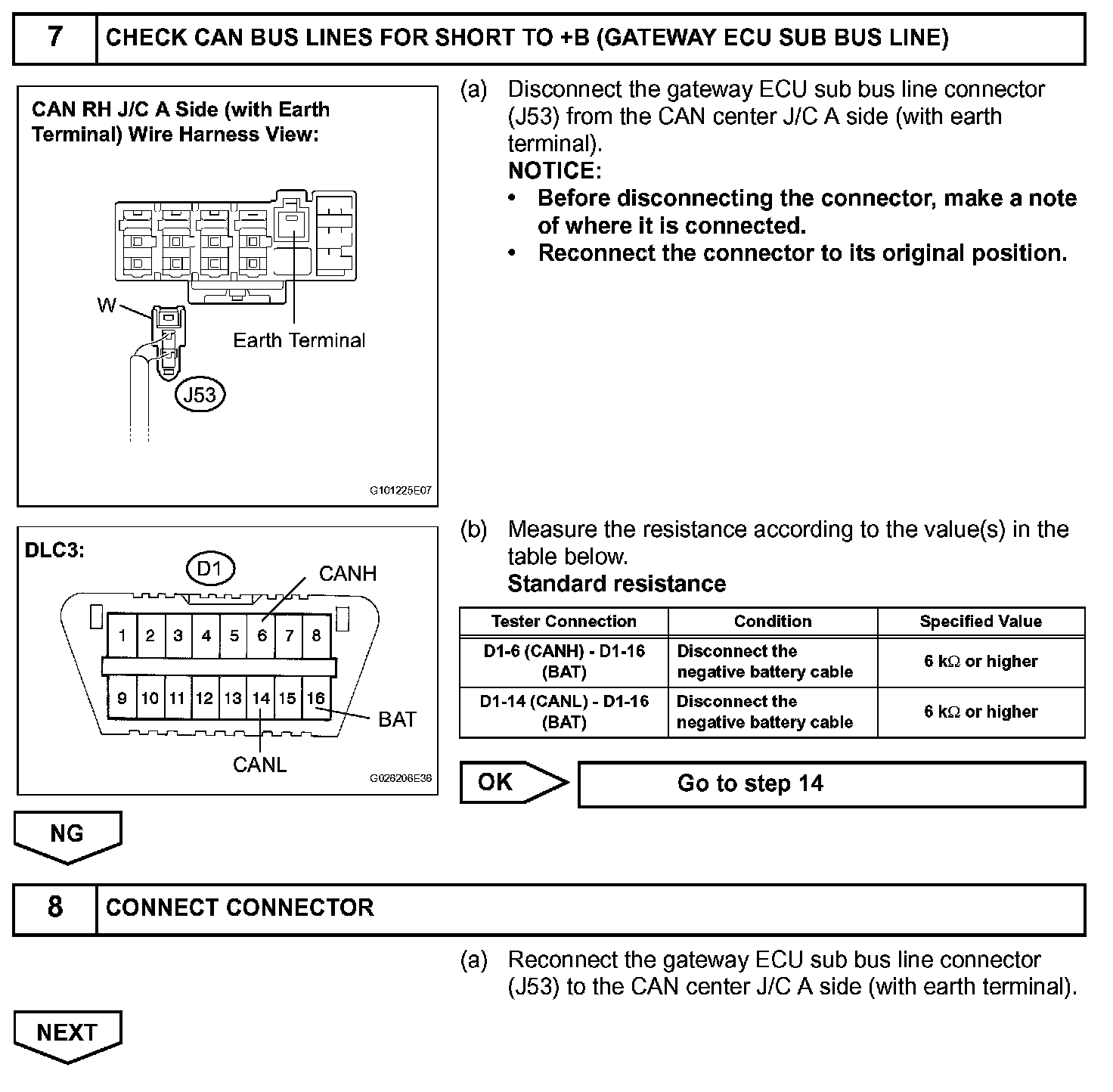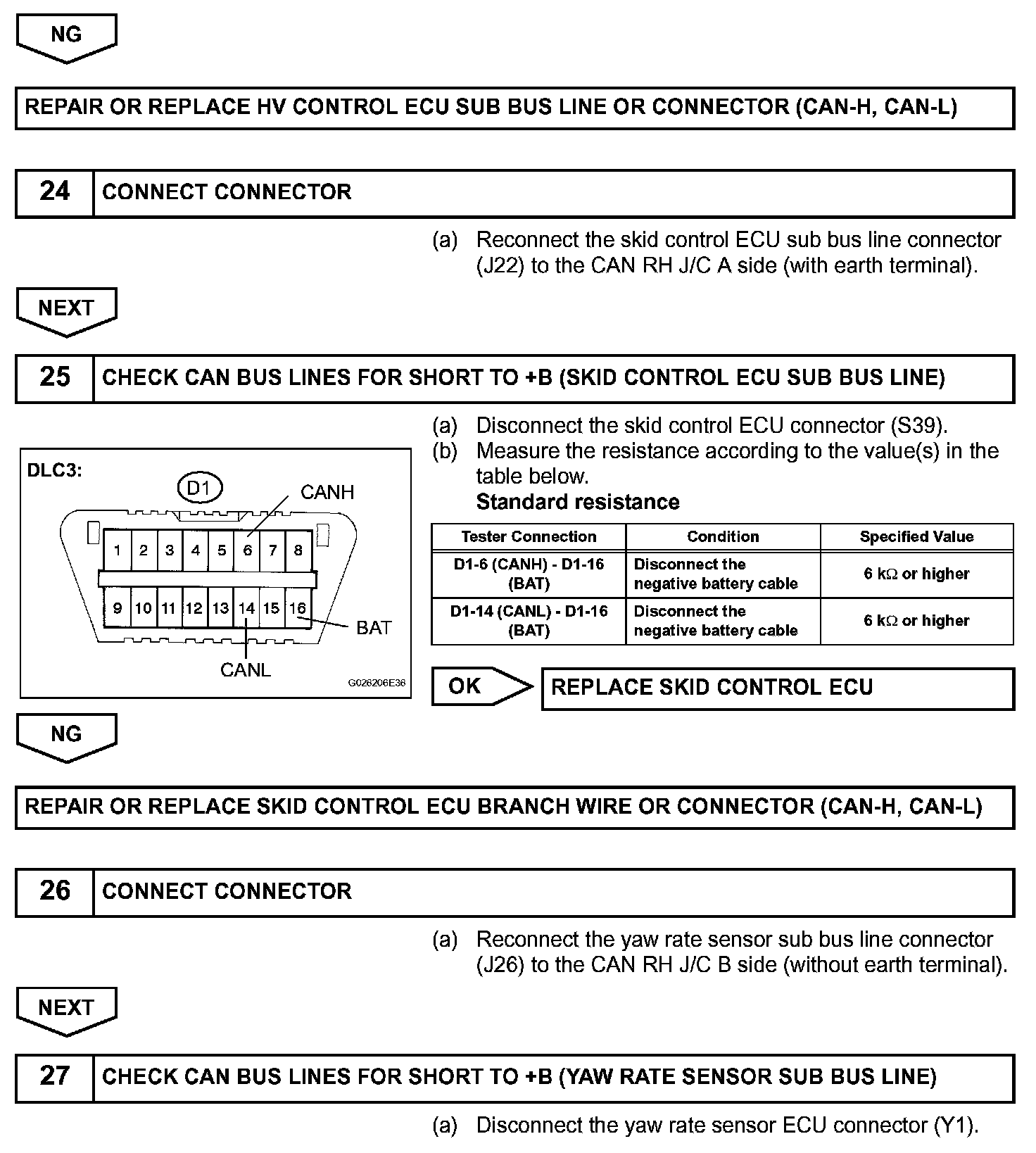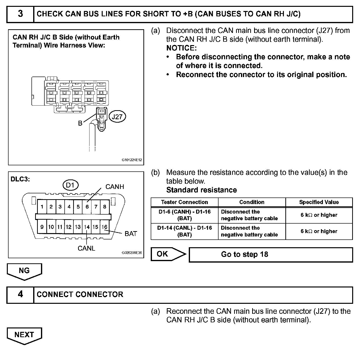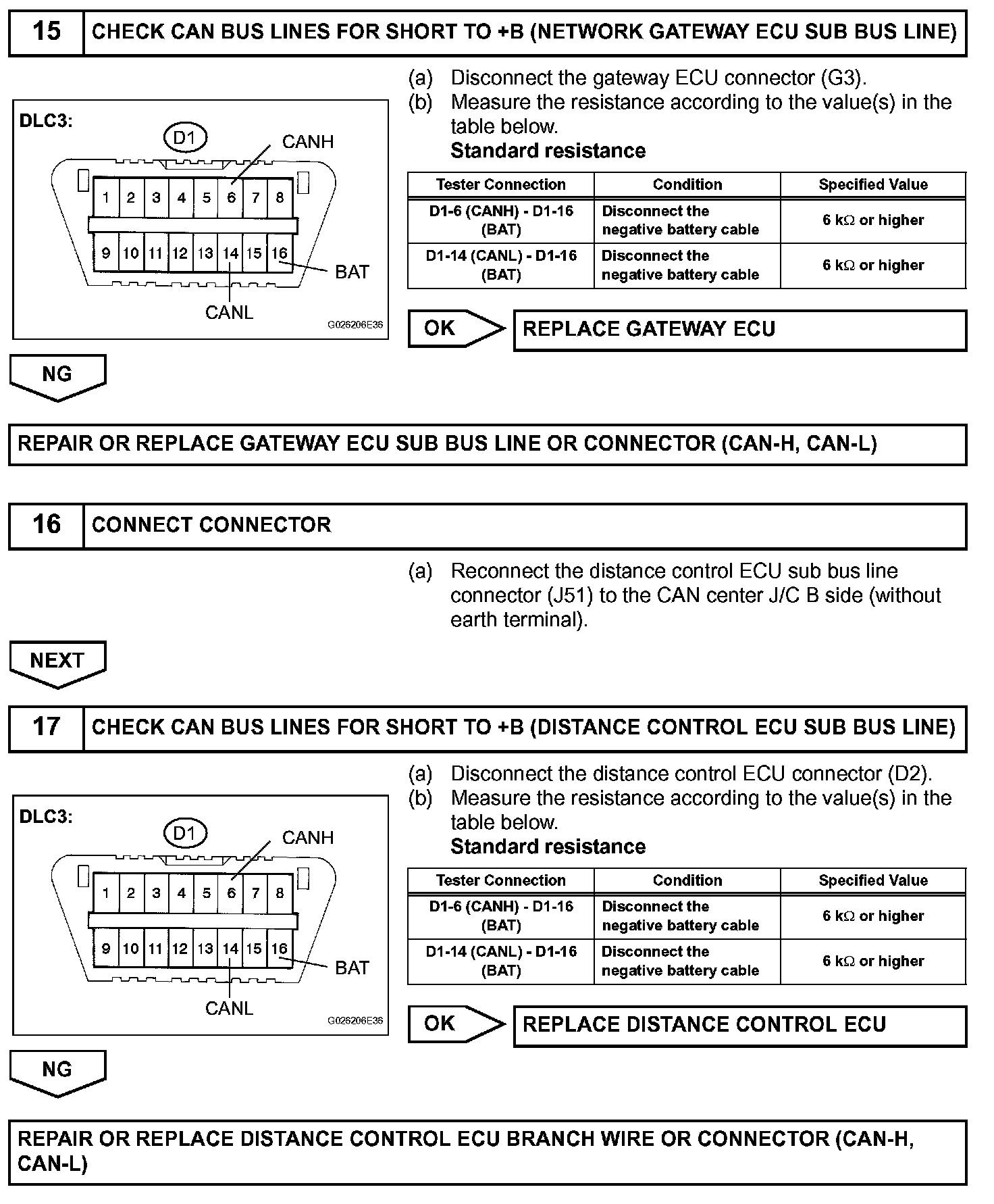 There may be a short circuit between the CAN bus line and B+ if there is continuity between terminals 6 (CANH) and 16 (BAT), or terminals 14 (CANL) and 16 (BAT) of the DLC3.