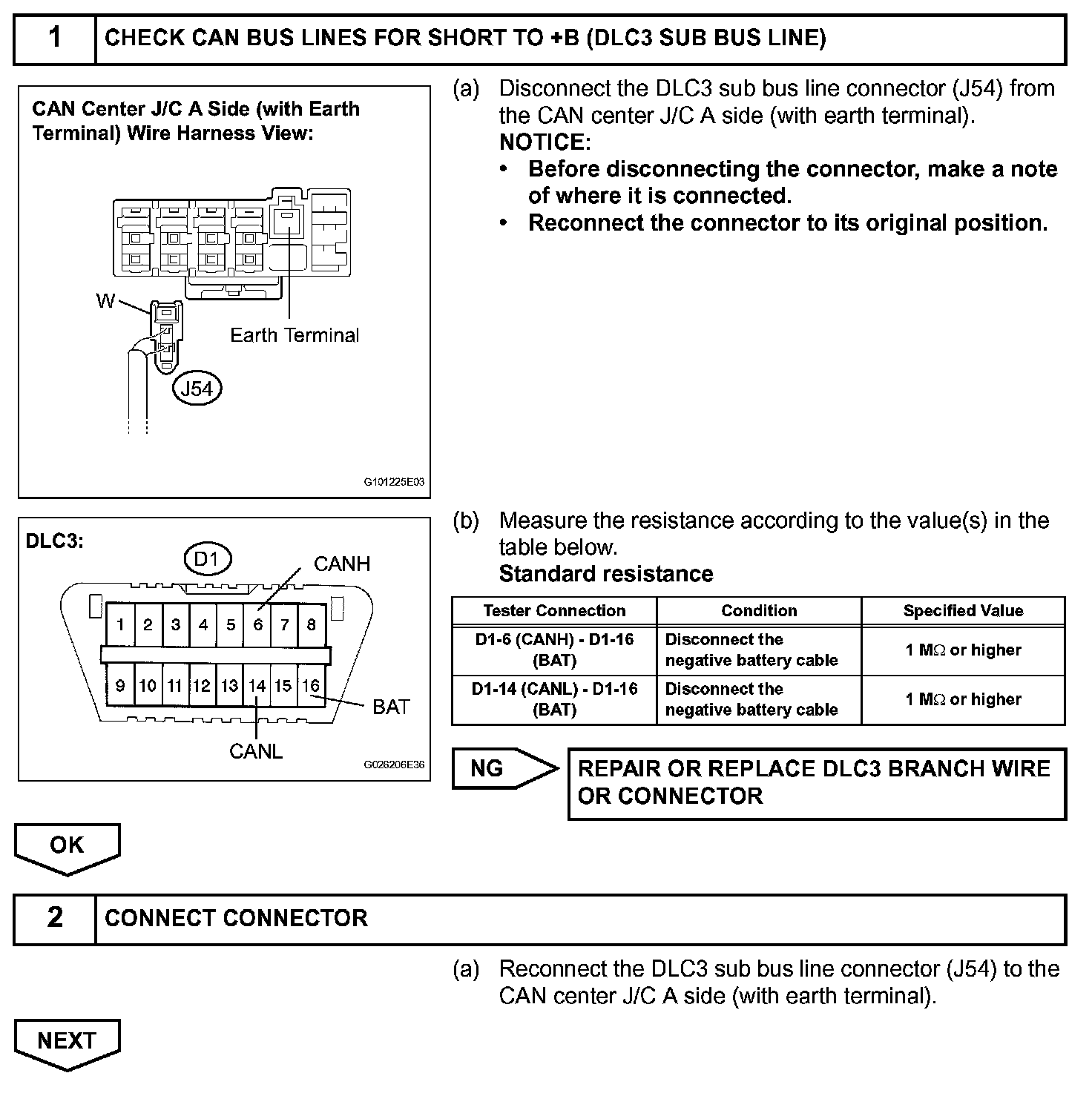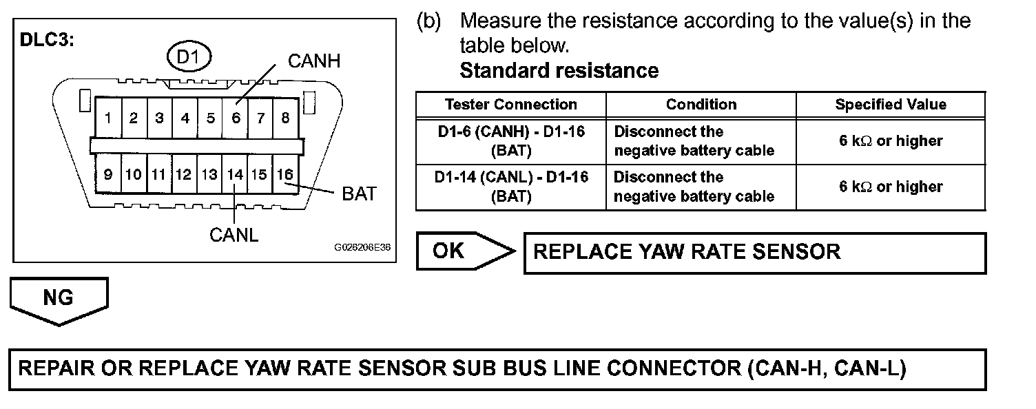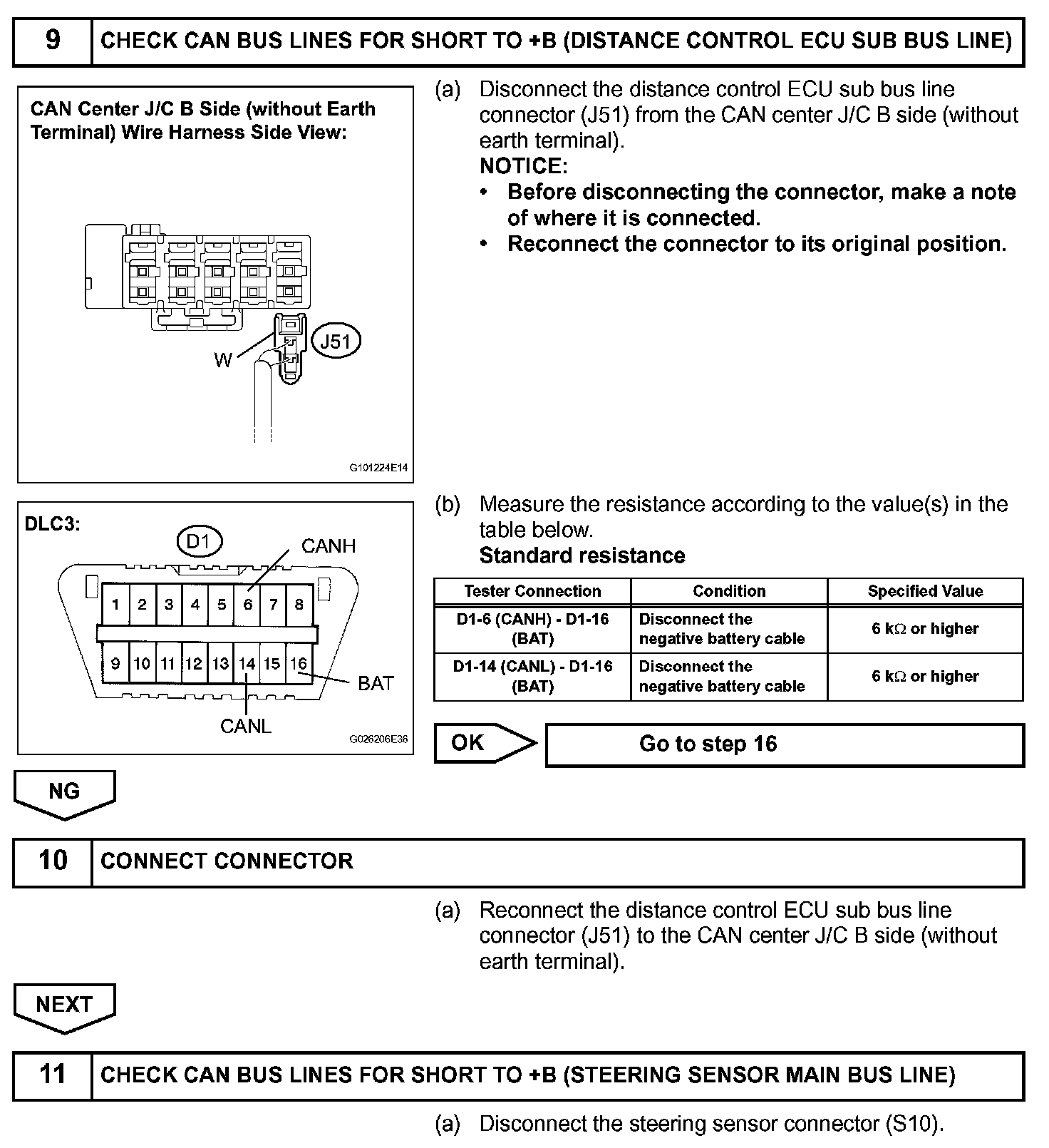 There may be a short circuit between the CAN bus line and B+ if there is continuity between terminals 6 (CANH) and 16 (BAT), or terminals 14 (CANL) and 16 (BAT) of the DLC3.