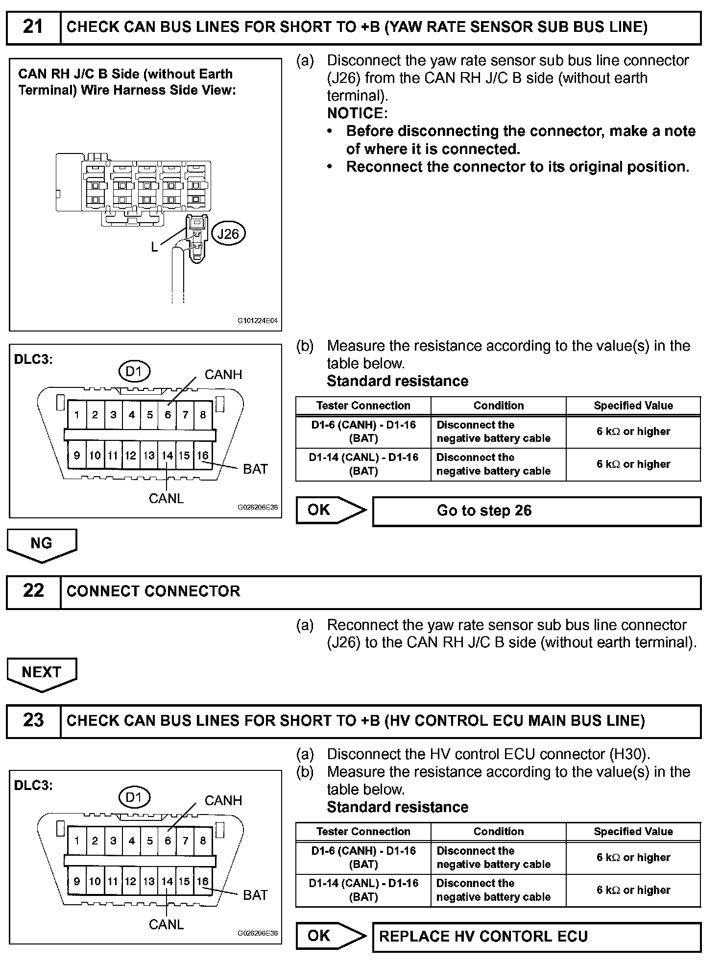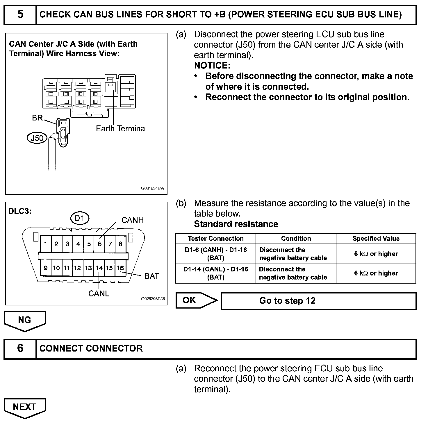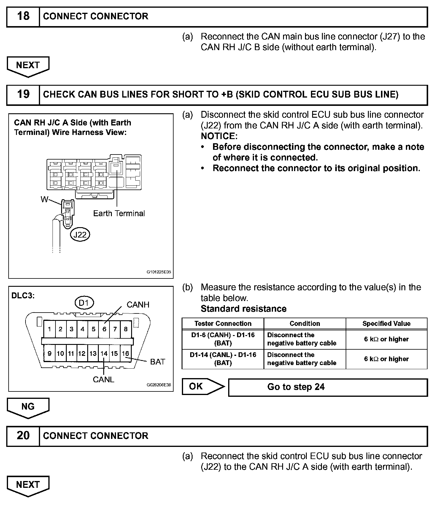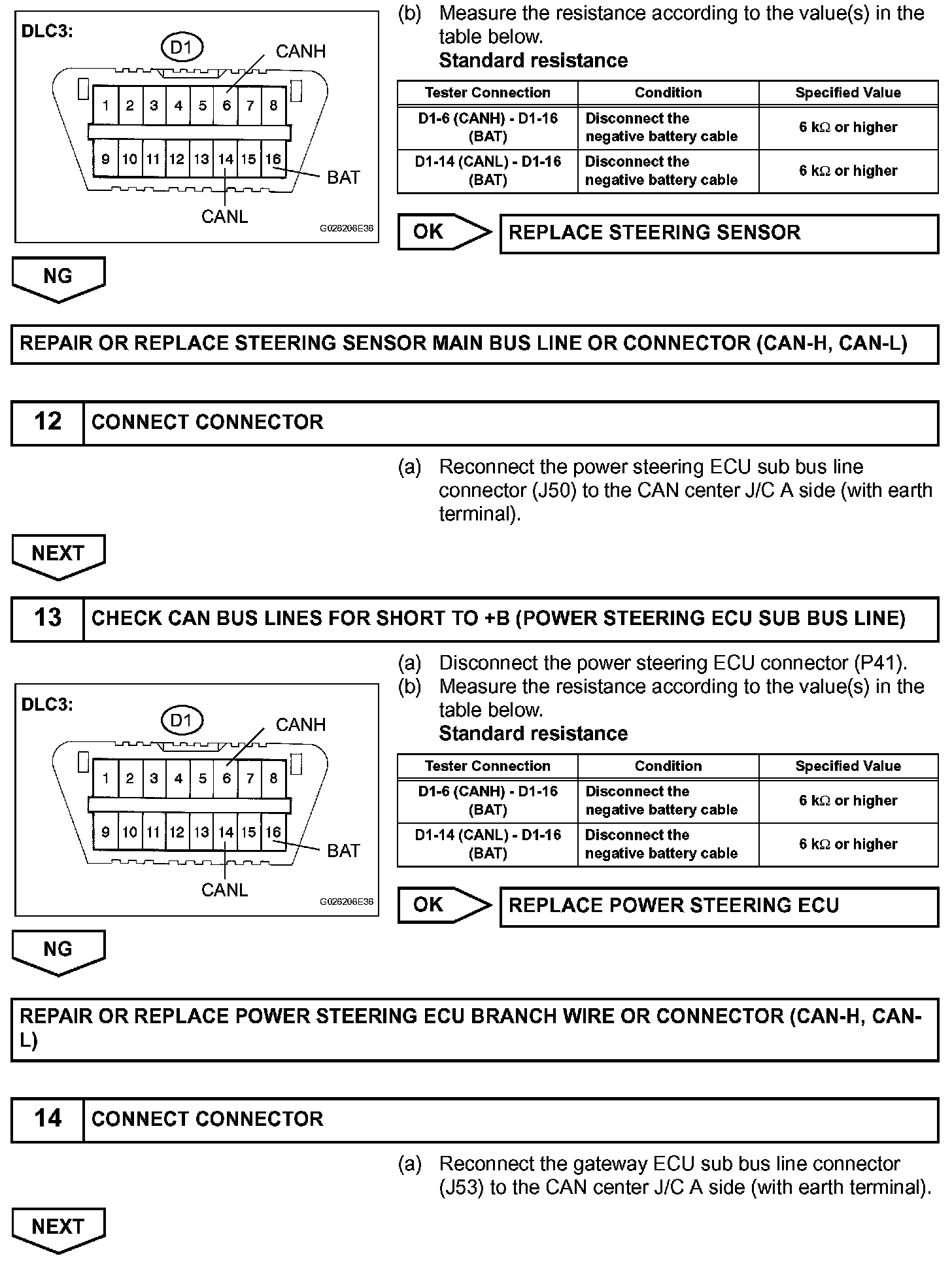 There may be a short circuit between the CAN bus line and B+ if there is continuity between terminals 6 (CANH) and 16 (BAT), or terminals 14 (CANL) and 16 (BAT) of the DLC3.