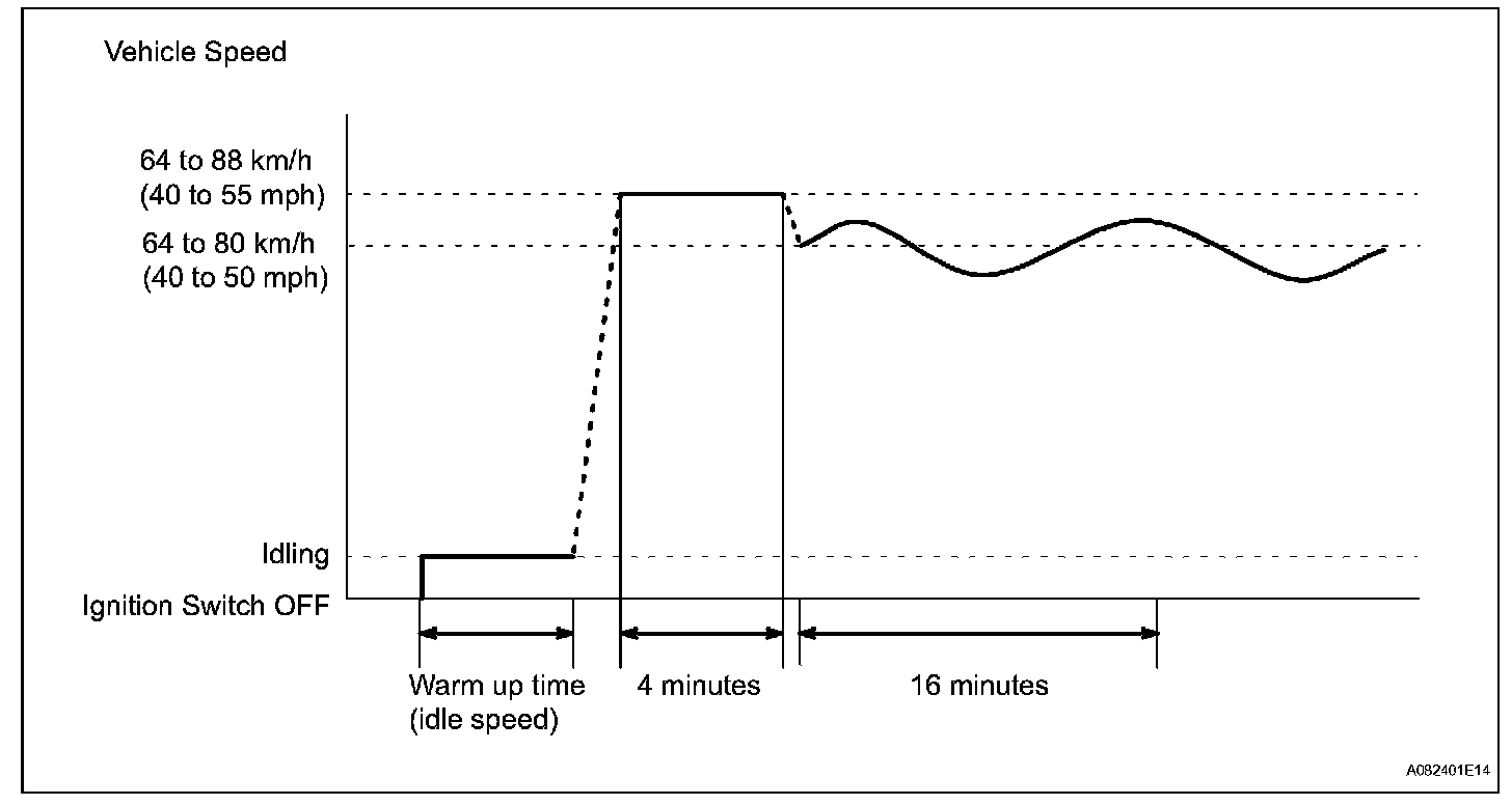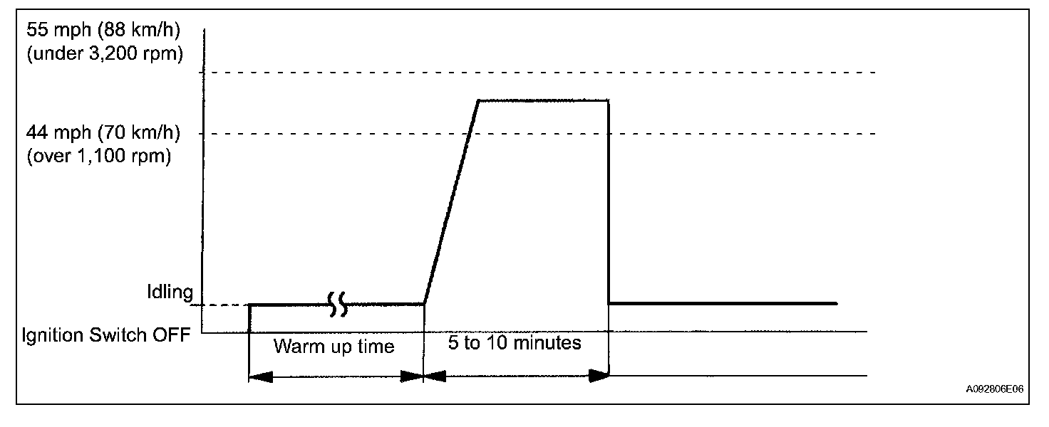 NOTE: Drive with smooth throttle operation and avoid sudden acceleration. If IAT was less than 10°C (50°F) when the engine was started, drive the vehicle at 47 to 55 mph (75 to 88 km/h) for additional 4 minutes.