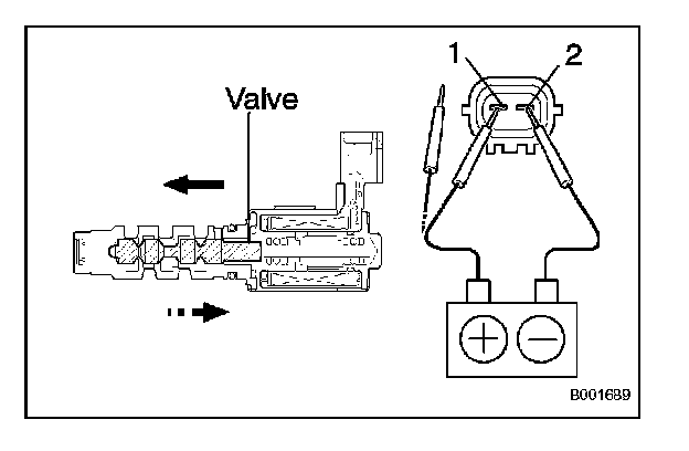 1. Connect the positive (+) lead from the battery to terminal 1 and negative (-) lead to terminal 2, and check the movement of the valve.