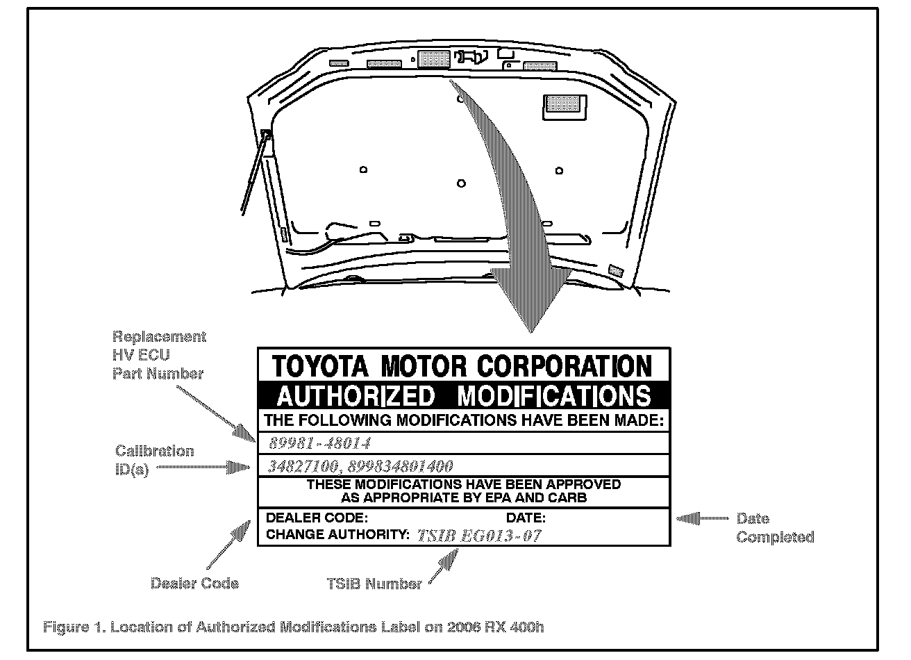 1. Check for the Authorized Modifications Label affixed to the vehicle in the location shown in Figure 1. Confirm if the HV ECU and ECM (PCM) calibrations have been updated. If the calibration IDs are NOT the latest calibrations go to step 2.