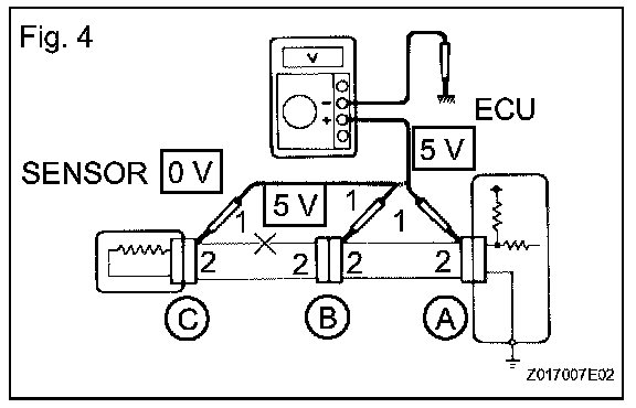If the results match the examples, an open circuit exists in the wire harness between terminal 1 of connector B and terminal 1 of connector C.