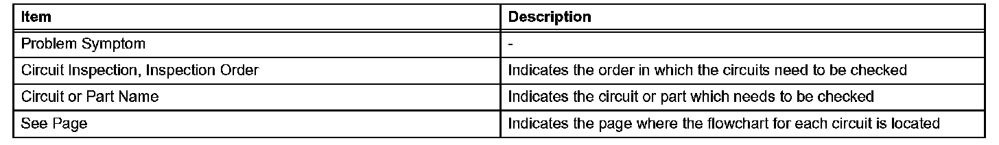 PROBLEM SYMPTOMS TABLEWhen a "Normal" code is output during a DTC check but the problem still occurs, use the Problem Symptoms Table. The suspected areas (circuits or parts) for each problem symptoms are in the table. The suspected areas are listed in order of probability. A description of each of the chart's columns is shown in the table.