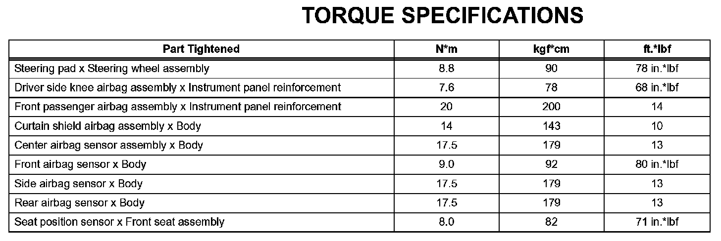 Supplemental Restraint System - Torque Specifications: