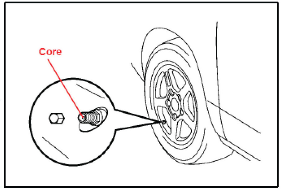 4. Press or remove the valve core to reduce the tire inflation pressure rapidly by 6 psi (0.4kgf/cm2, 40kPa), or more, within 30 seconds.
