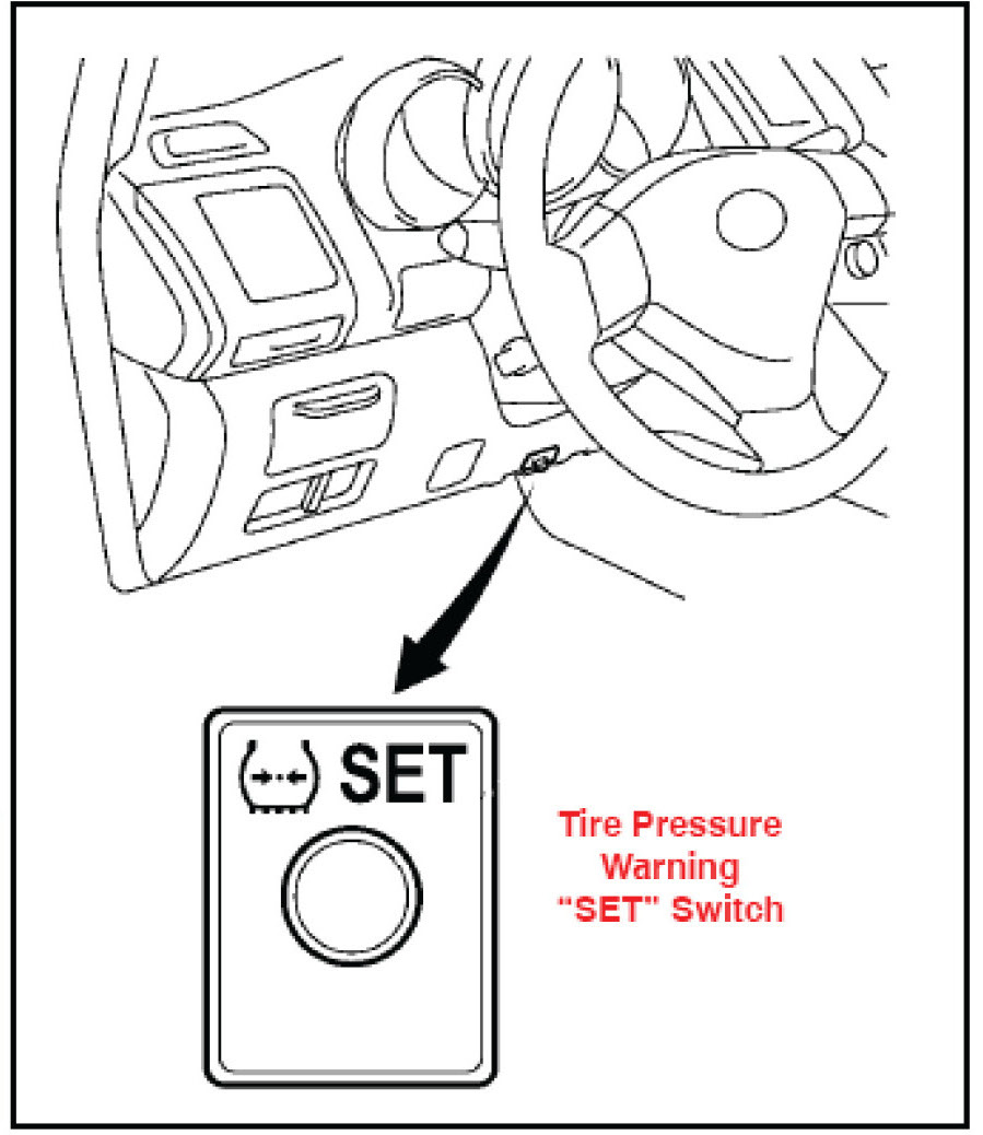 7. Push and hold the Tire Pressure Warning "SET" Switch for 3 seconds until the Low Tire Pressure Warning Light blinks 3 times and then turns OFF to set the tire pressure initialization.