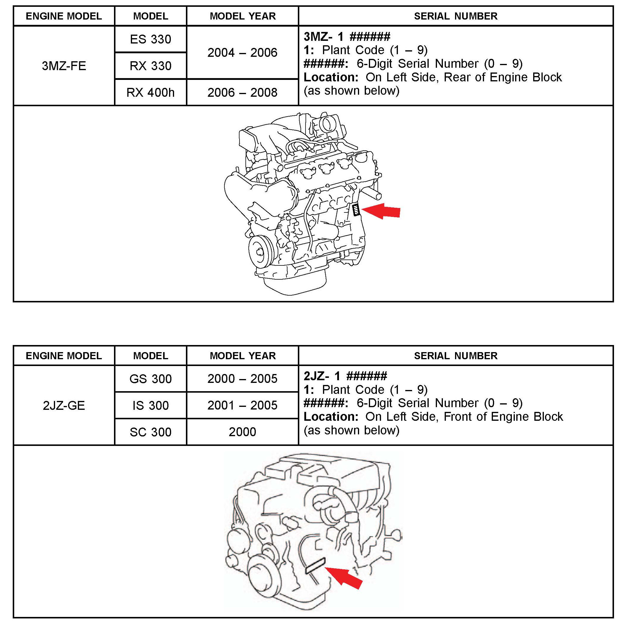 The purpose of this TSIB is to assist in the identification and location of engine serial numbers on 2000 - 2010 model year Lexus vehicles.