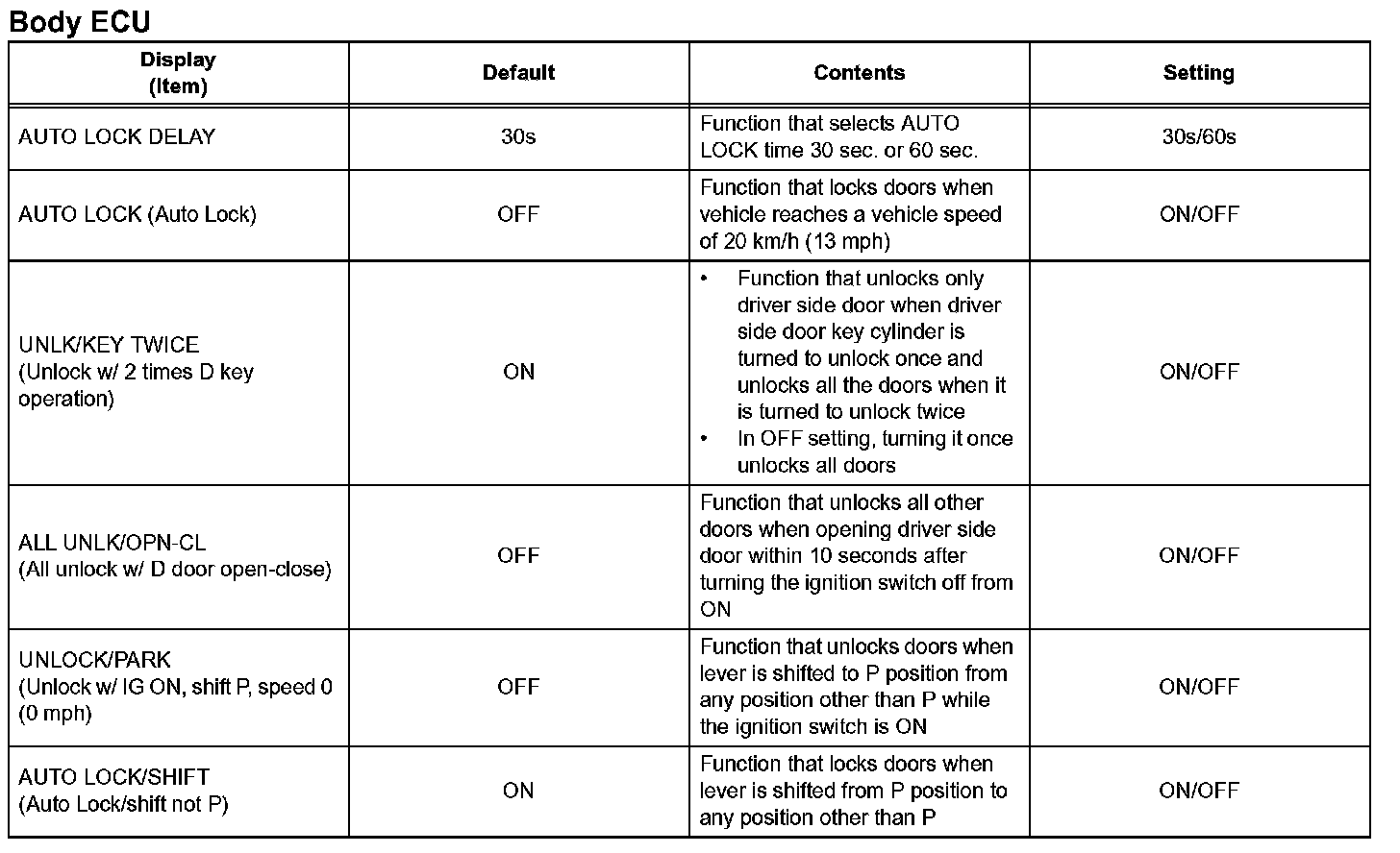 The buzzer ON/OFF setting, which is a setting of the buzzer function of the combination meter, can disable the driver side seat belt buzzer and front passenger side seat belt buzzer.