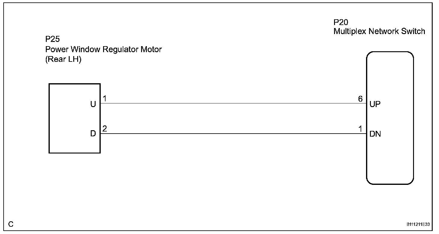 This circuit transmits signals from the multiplex network switch to power window regulator motor.