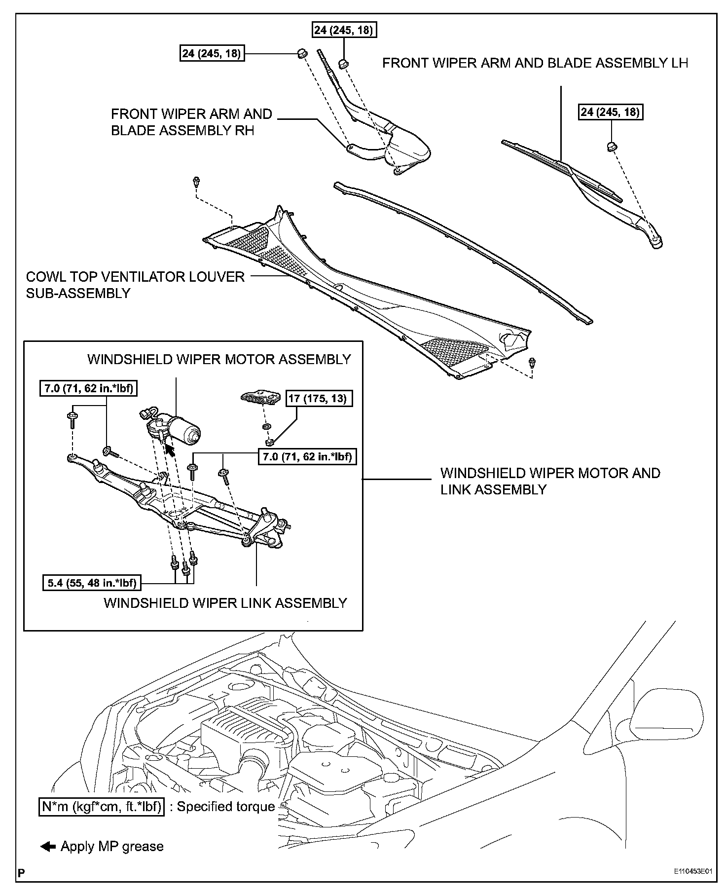 b. Apply MP grease to the crank arm pivot of the windshield wiper motor assembly.